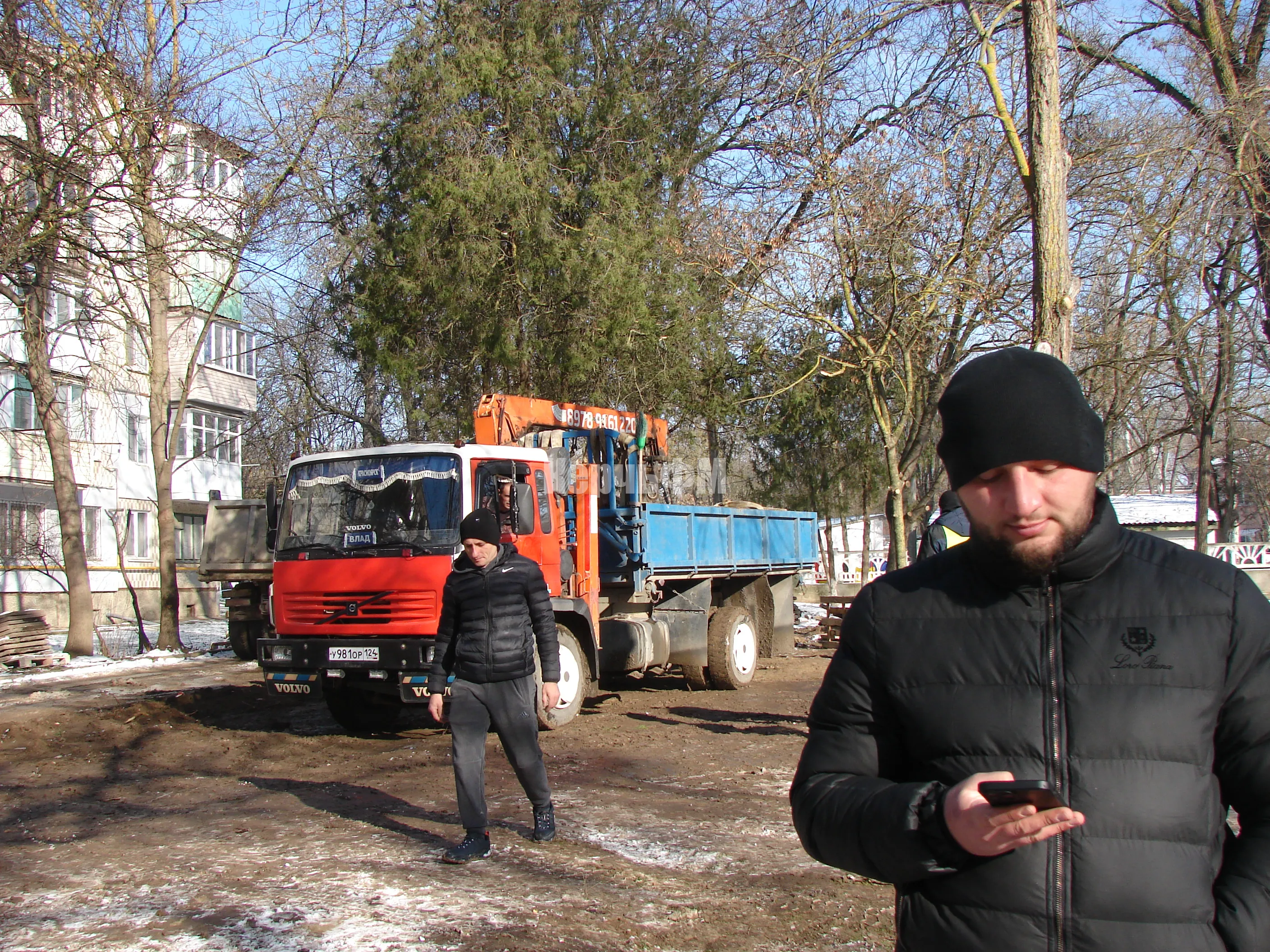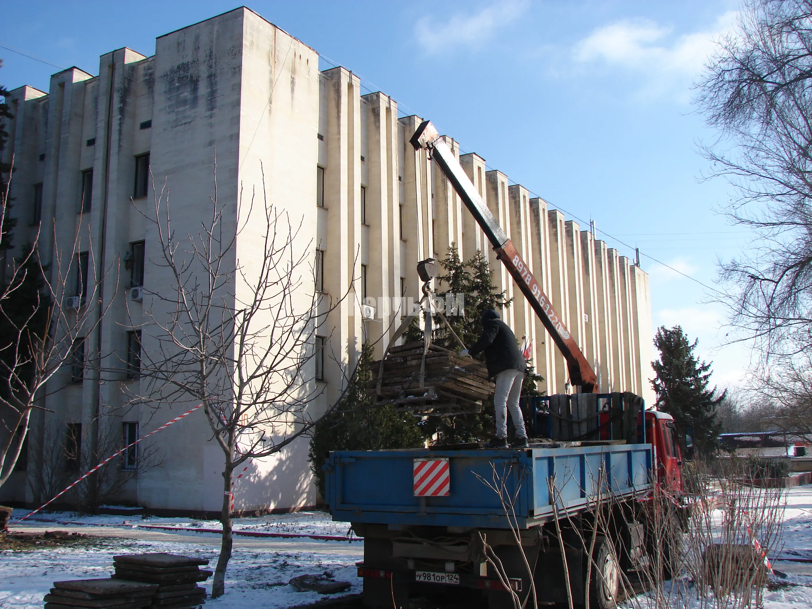 Сегодня их уже начали вывозить из сквера, который находится слева от здания.