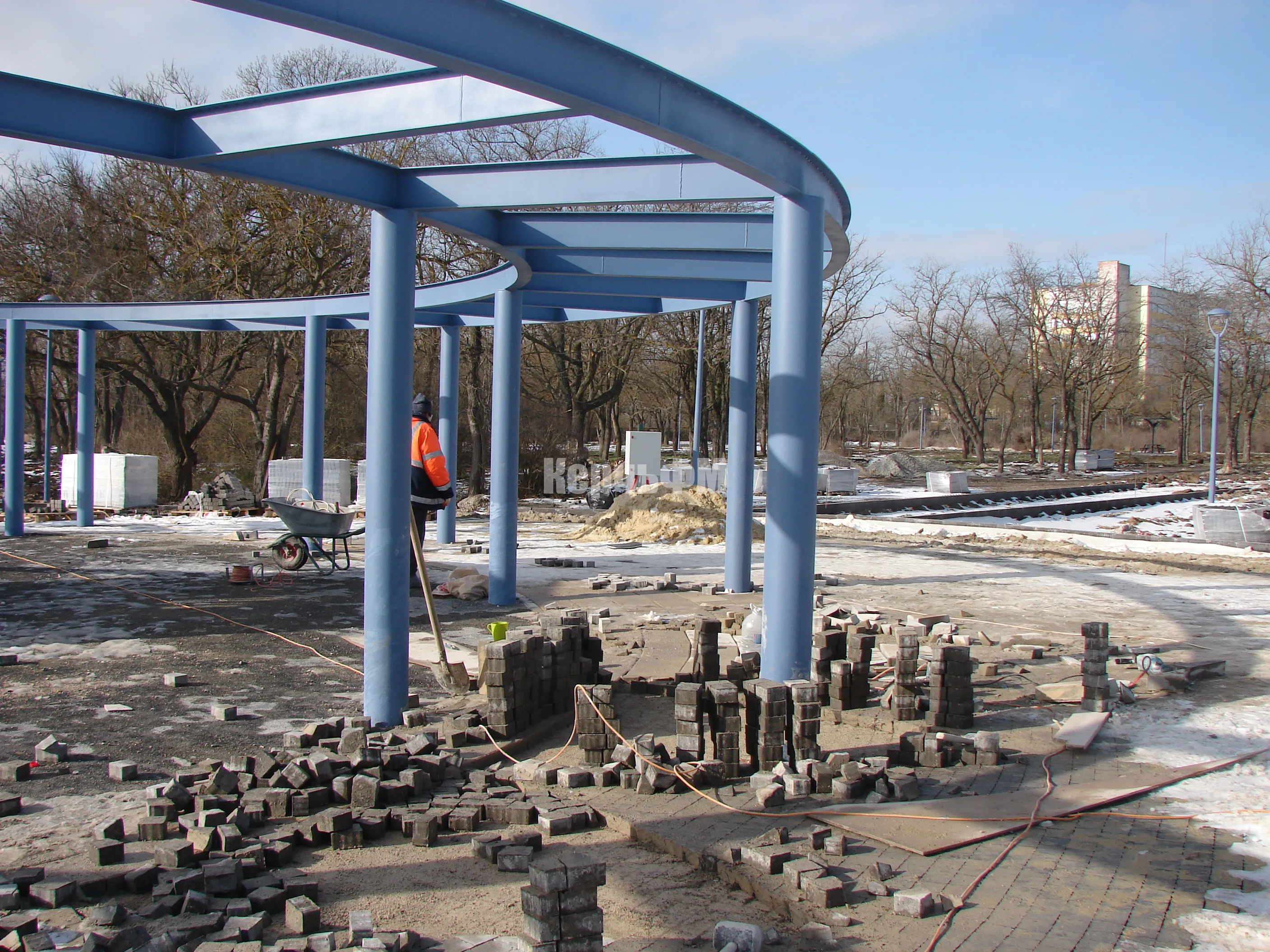 В Приморском парке близятся к завершению работы по укладке новой тротуарной плитки возле фонтана, под перголами.