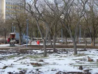 С боковых сторон, и в начале парка, и в конце центральной аллеи, работает тяжелая техника, которая помогает готовить землю под дальнейшее мощение.