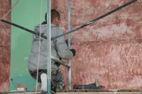 Сейчас строители устанавливают маяки для выравнивания стен. Следующий этап - нанесение штукатурки. После стен строители приступят к устройству оконных откосов и ремонту потолка.