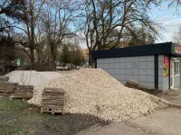 В течение двух рабочих недель, несмотря на сложные погодные условия, вся старая тротуарная плитка слева от здания была демонтирована, включая бордюры вдоль прилегающей дороги.