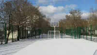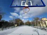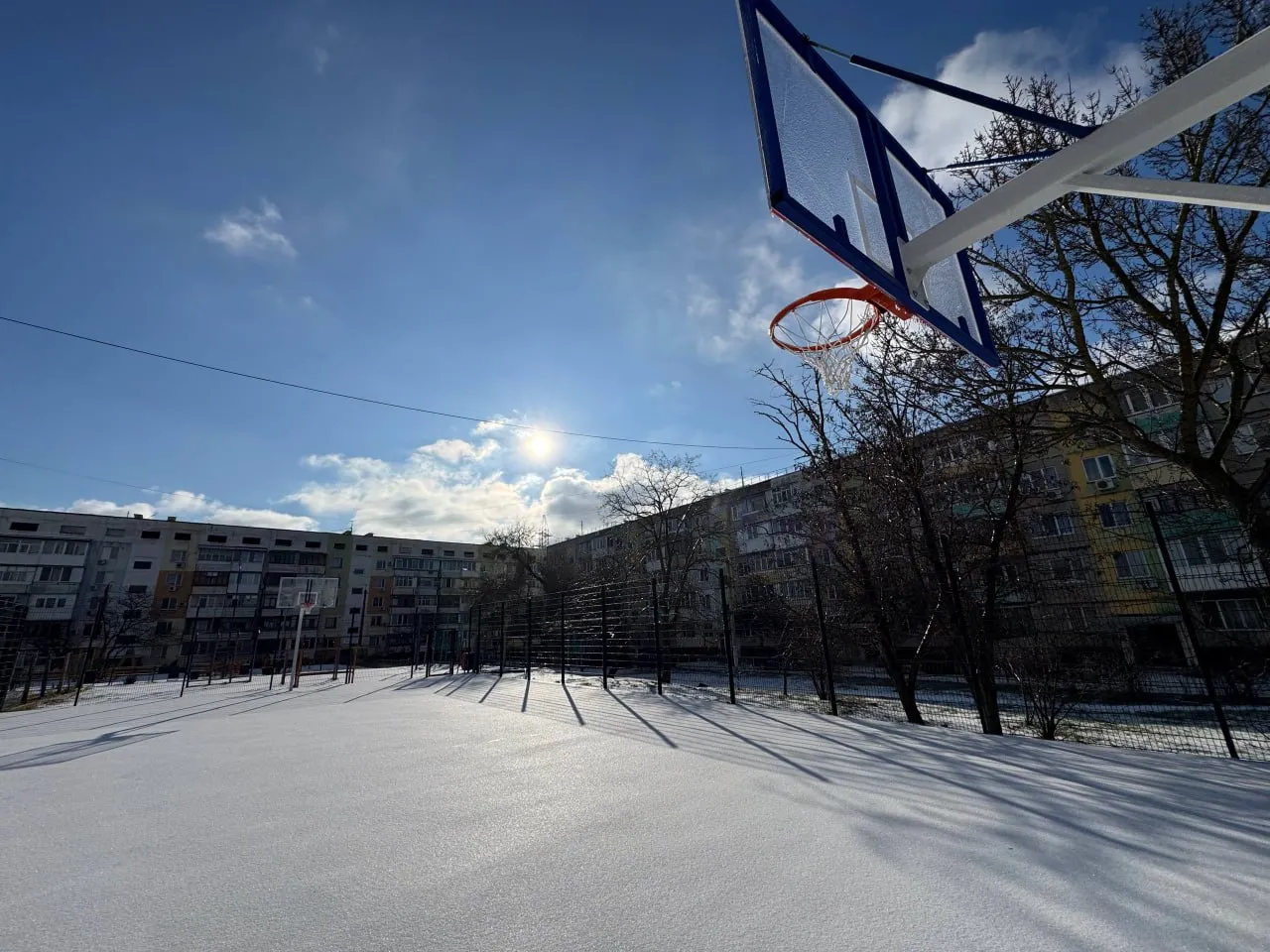 На баскетбольной площадке установлены новые ограждения, опоры и щиты, а также уложено резиновое покрытие и нанесена разметка для удобства тренировок и соревнований.