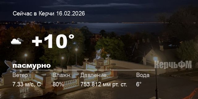 Сегодня днем в Керчи, 16 февраля, ожидается пасмурная погода, температура воздуха от +5.9° до +10.3°С, ветер северный 4.84 м/с, порывы до 13.27 м/с, давление 755.3 мм рт. ст., влажность 77%.