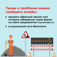 Чтобы дорожники могли быстрее наводить порядок, сообщайте о проблемах в диспетчерскую службу «Крымавтодора». Сигнализировать можно о ямах на проезжей части, снежных заносах, пропавших знаках или необходимости грейдирования.