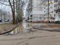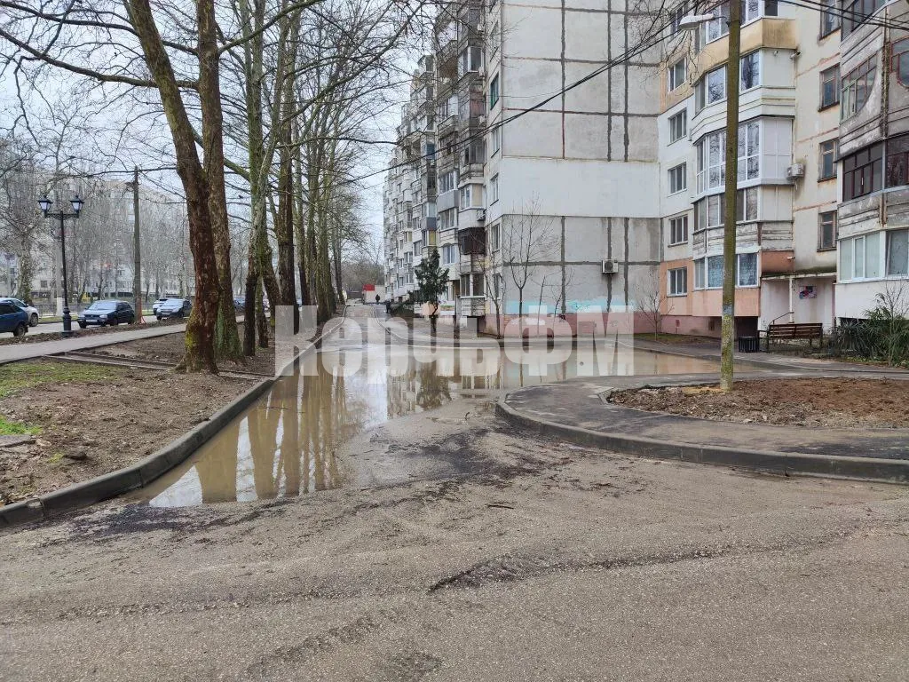 На новой подъездной дороге, со стороны фасада дома, ближе к правому торцу здания, образовалась огромная лужа.