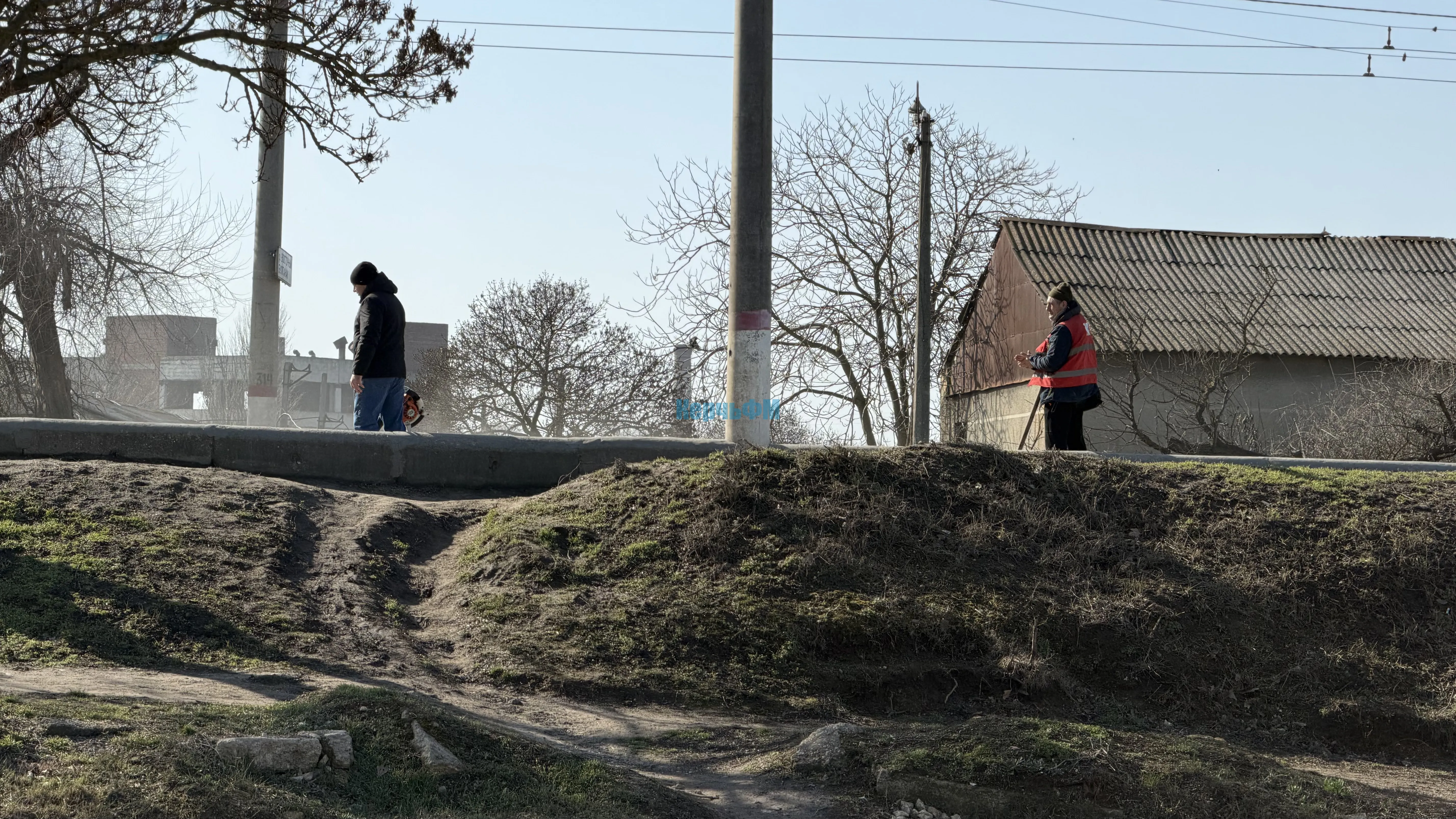 Рабочие очищают дорожное полотно вдоль бордюров, убирая скопившуюся за зиму грязь и наносы. Параллельно ведётся очистка тротуаров. Собранный мусор и грязь складывают в специальные пакеты для последующего вывоза.