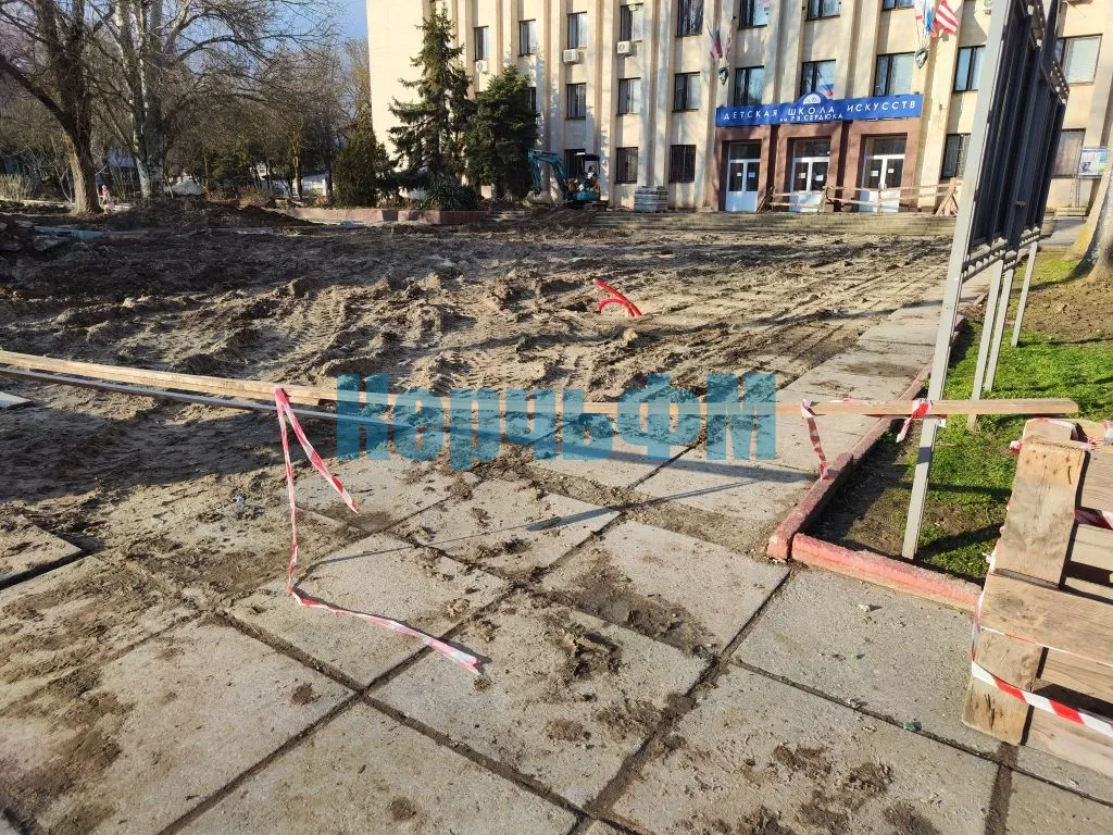 На площади перед ним продолжается демонтаж тротуарных плит.
