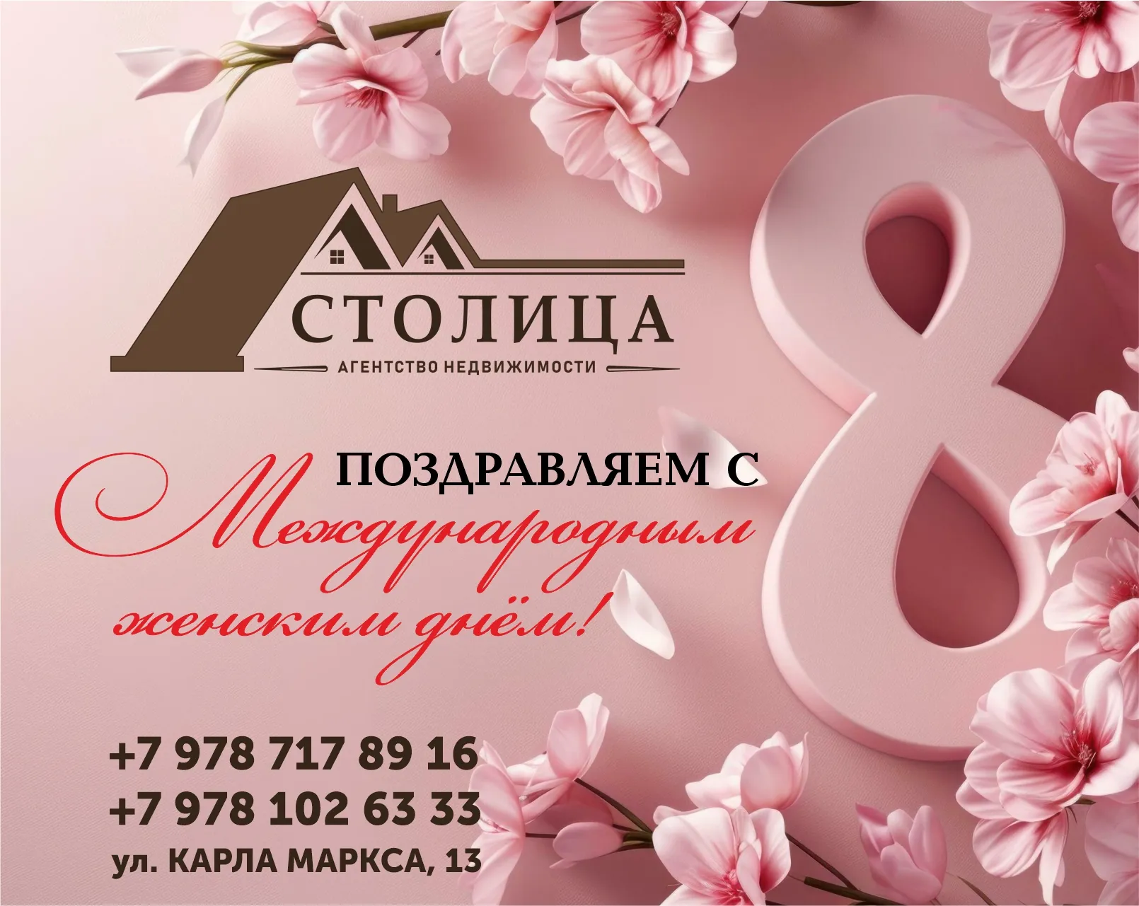 От всего сердца агентство недвижимости "Столица" поздравляет вас с чудесным праздником - Международным женским днем, 8 марта!