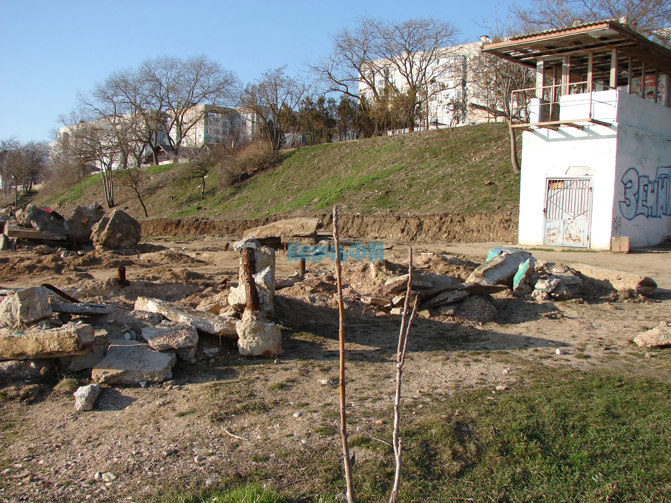 Не все металлоконструкции вывезены, не вся чаша бывшей большой песочницы демонтирована, не убраны бетонные глыбы, передает КерчьФМ.