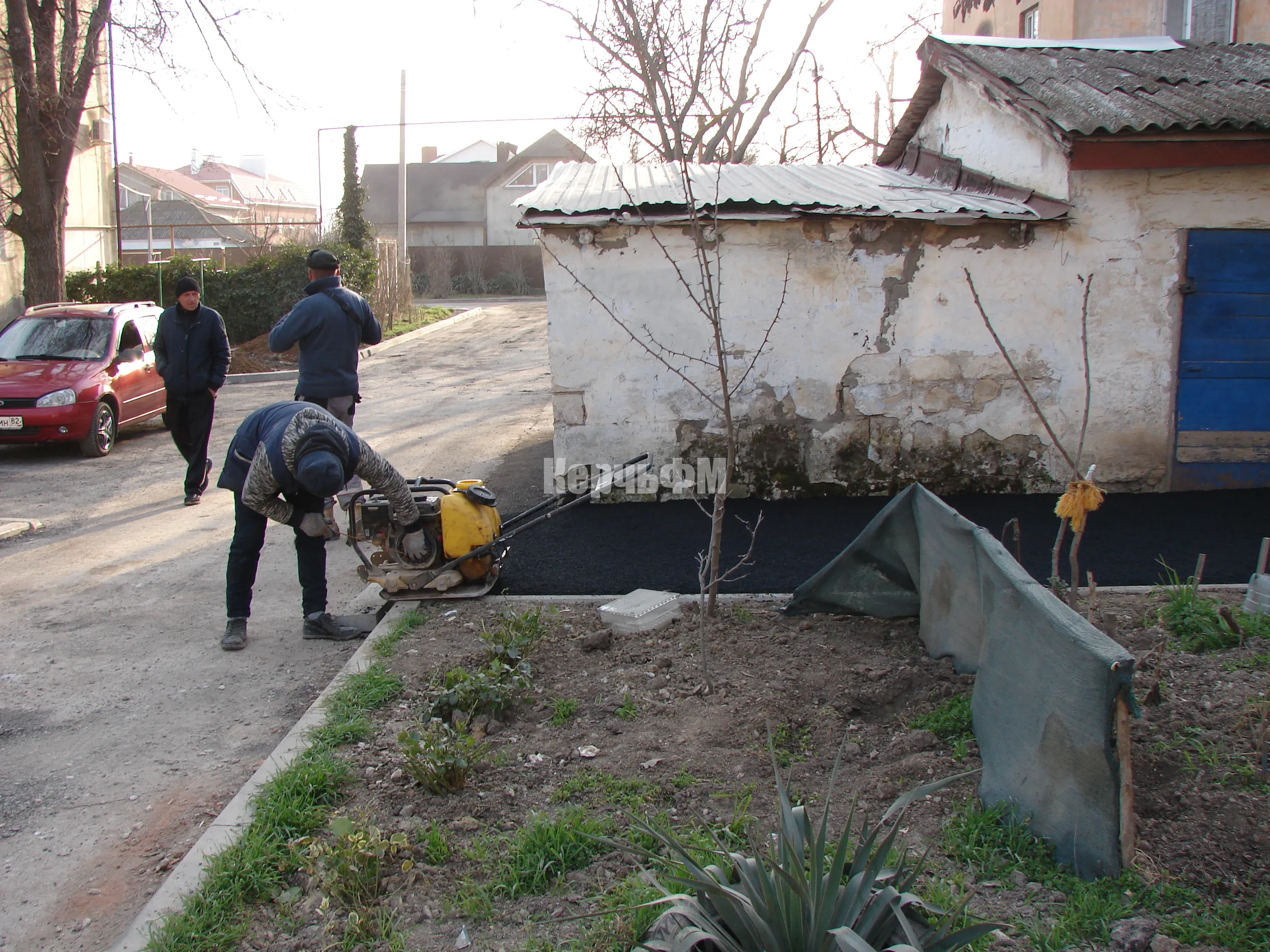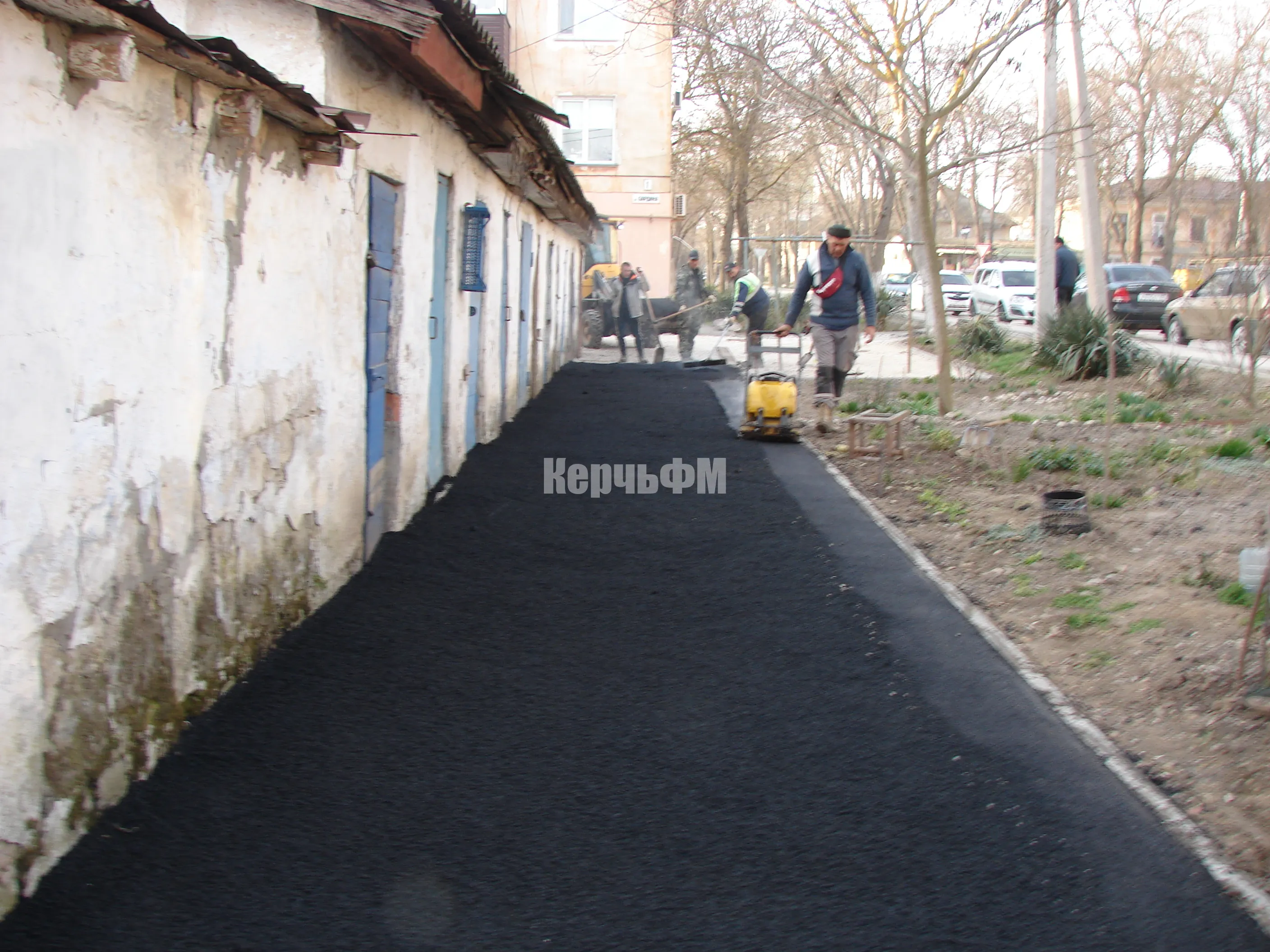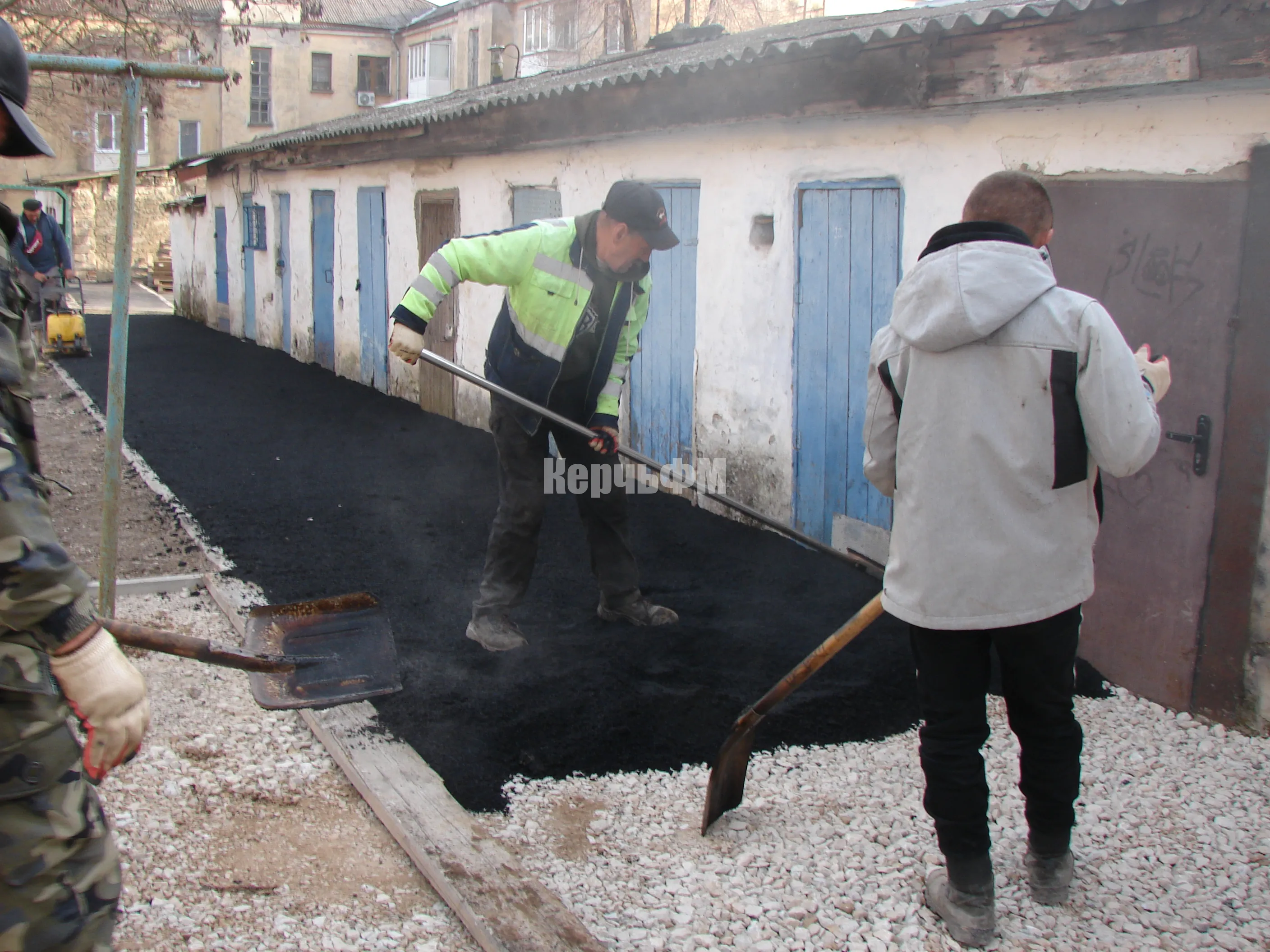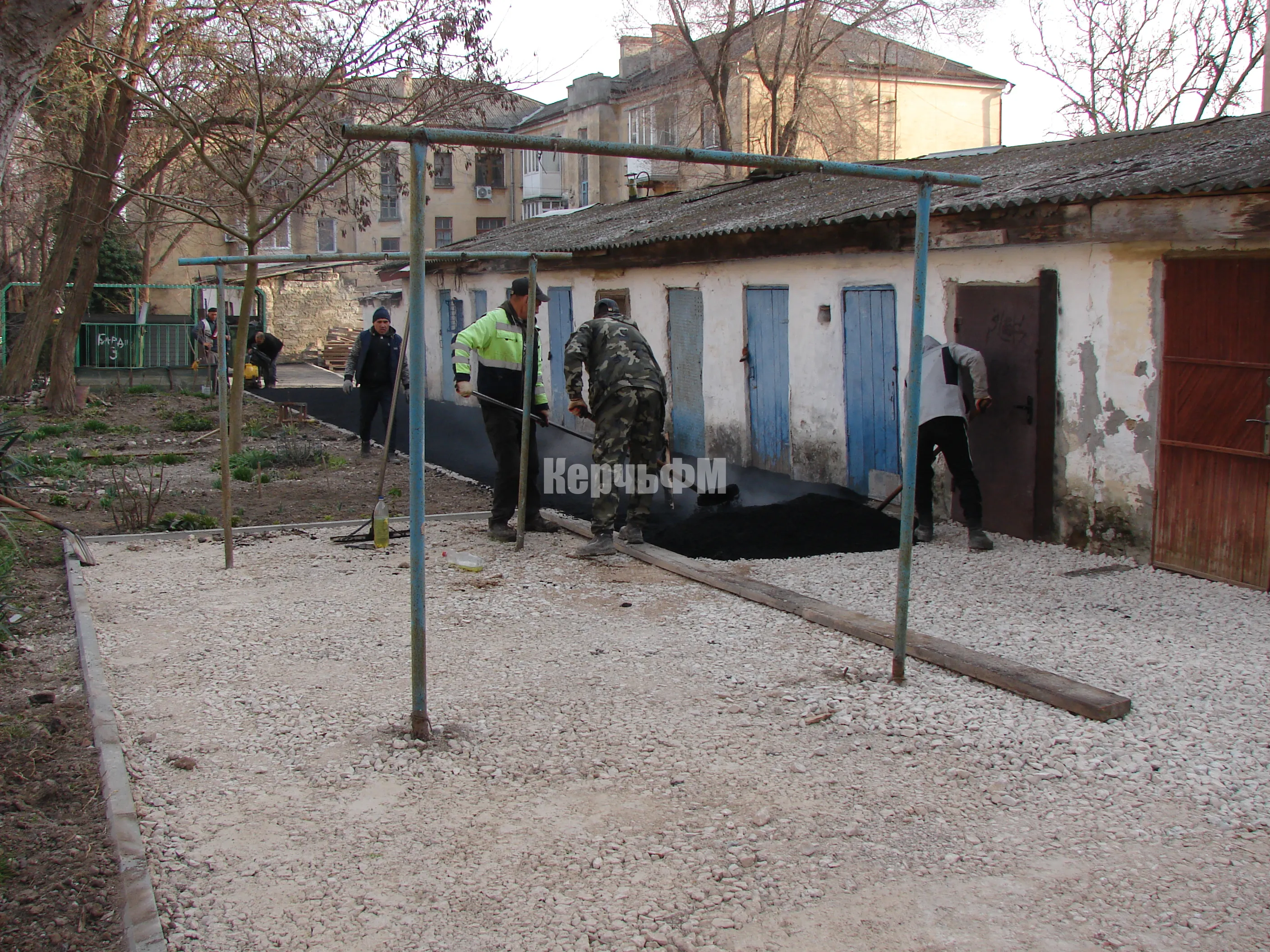 Накануне рабочие укладывали асфальт у хозпостроек дома № 1.