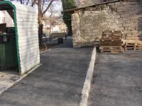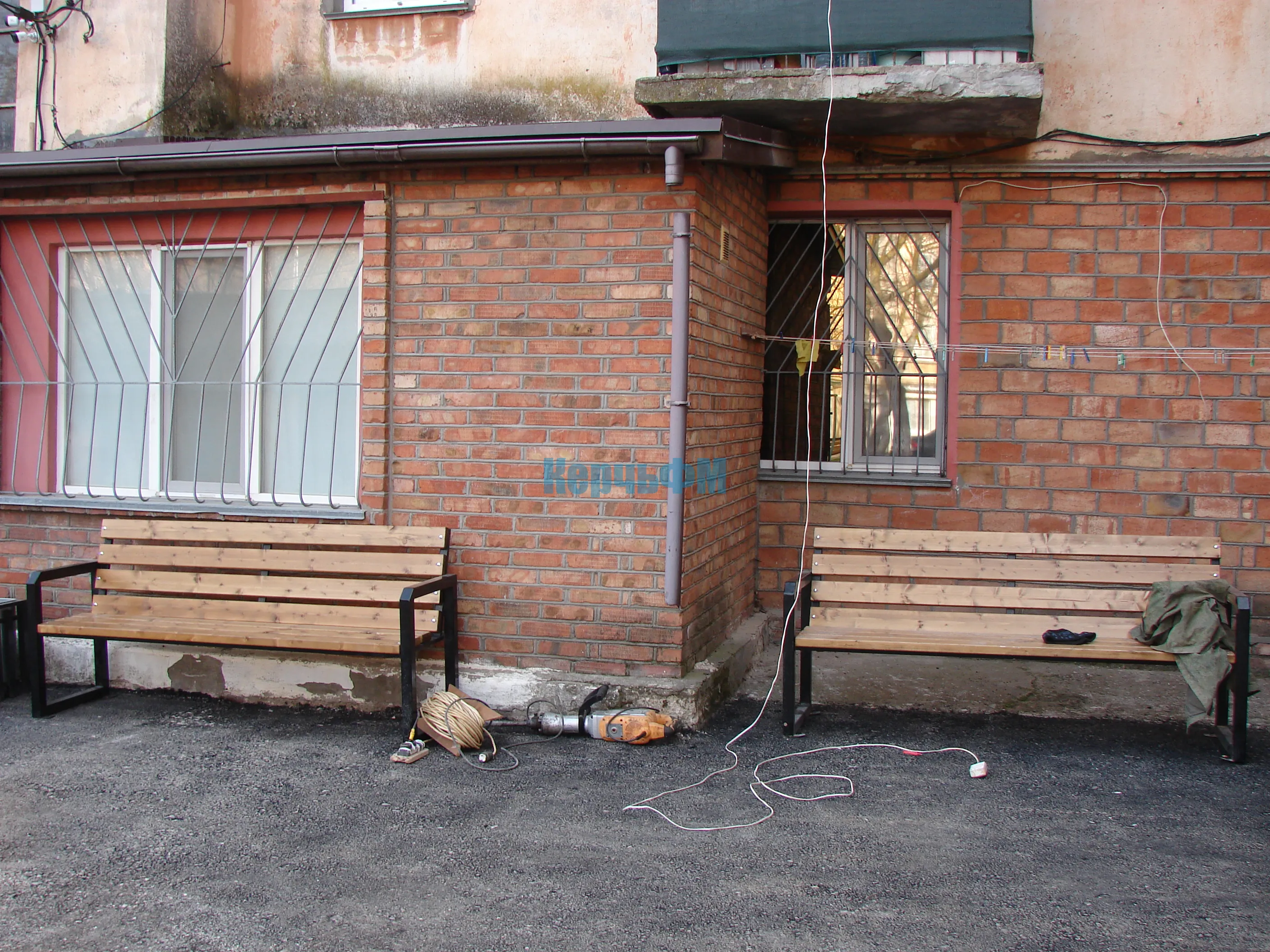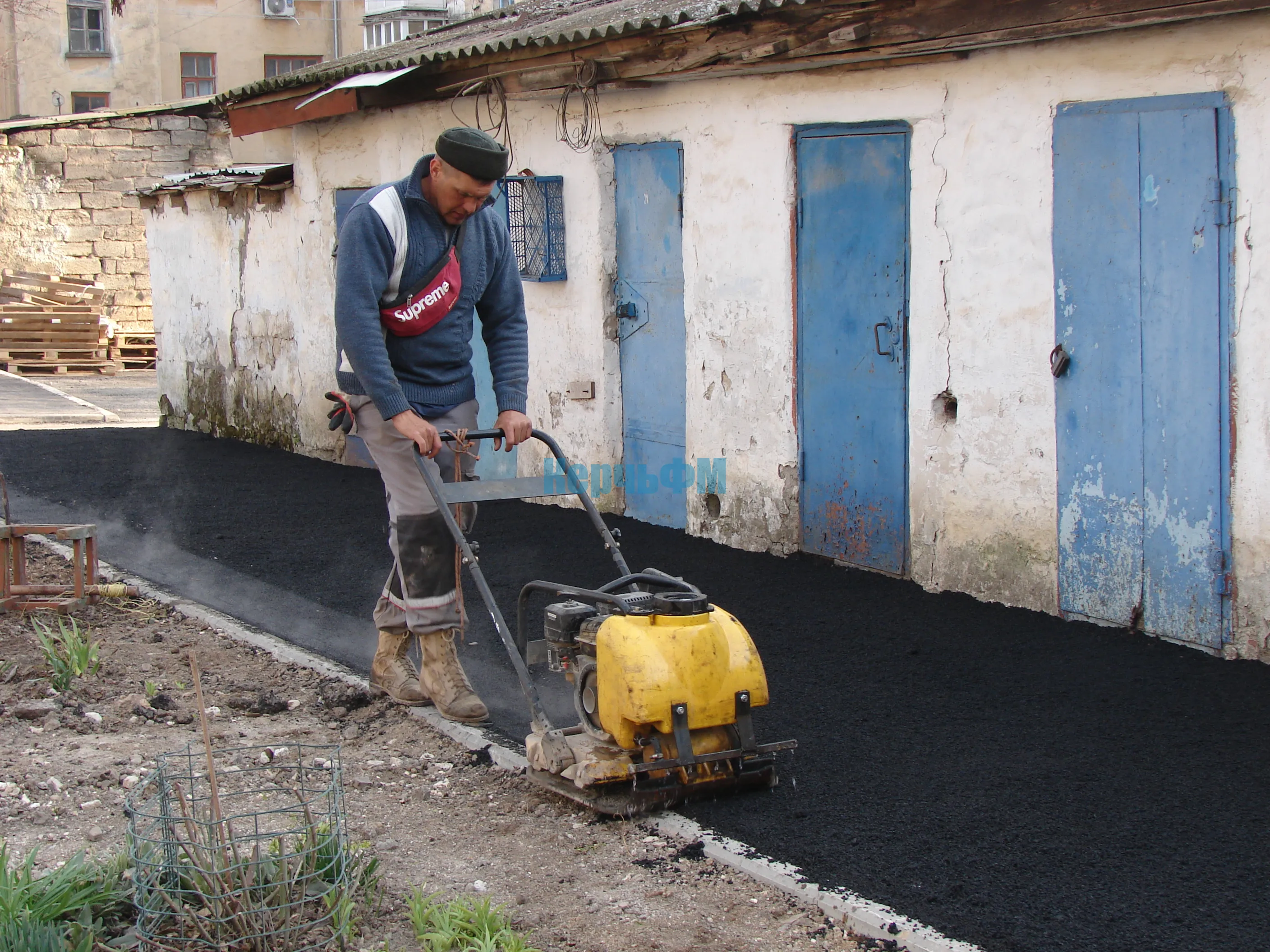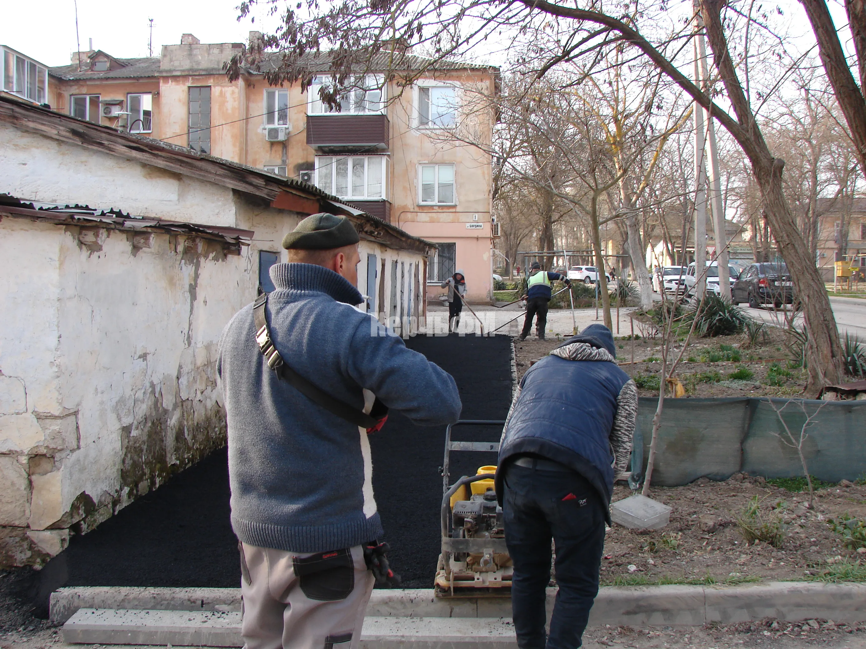 Накануне рабочие укладывали асфальт у хозпостроек дома № 1.