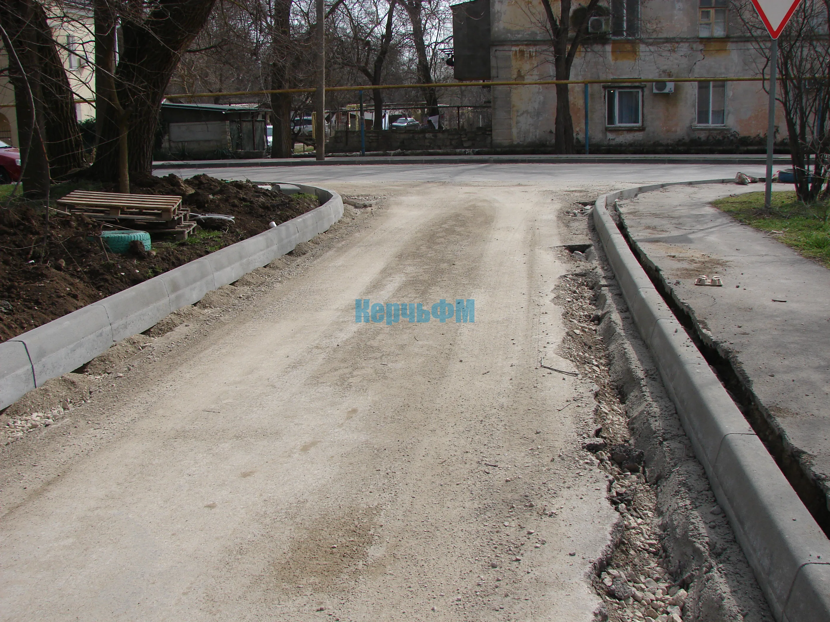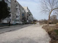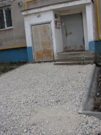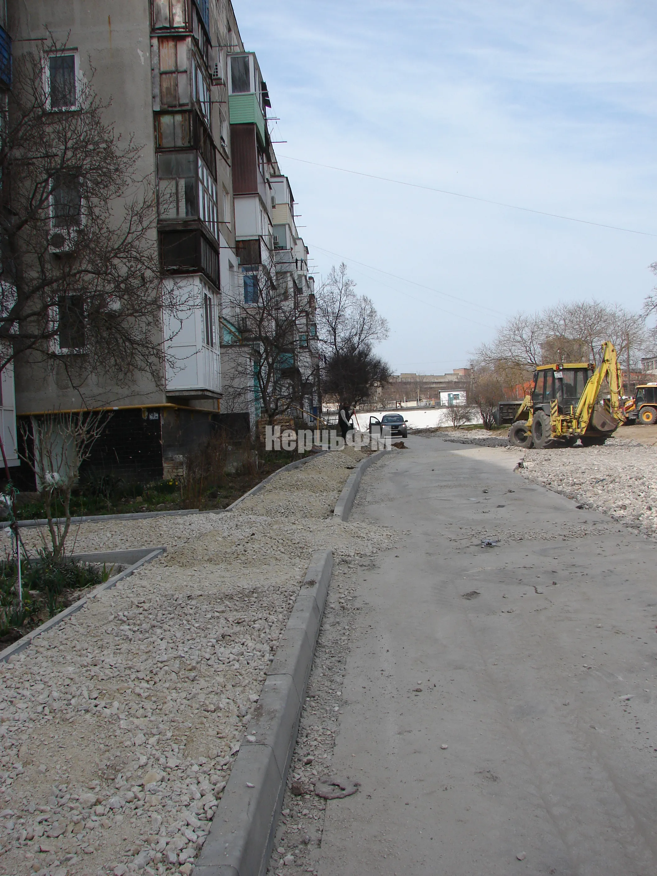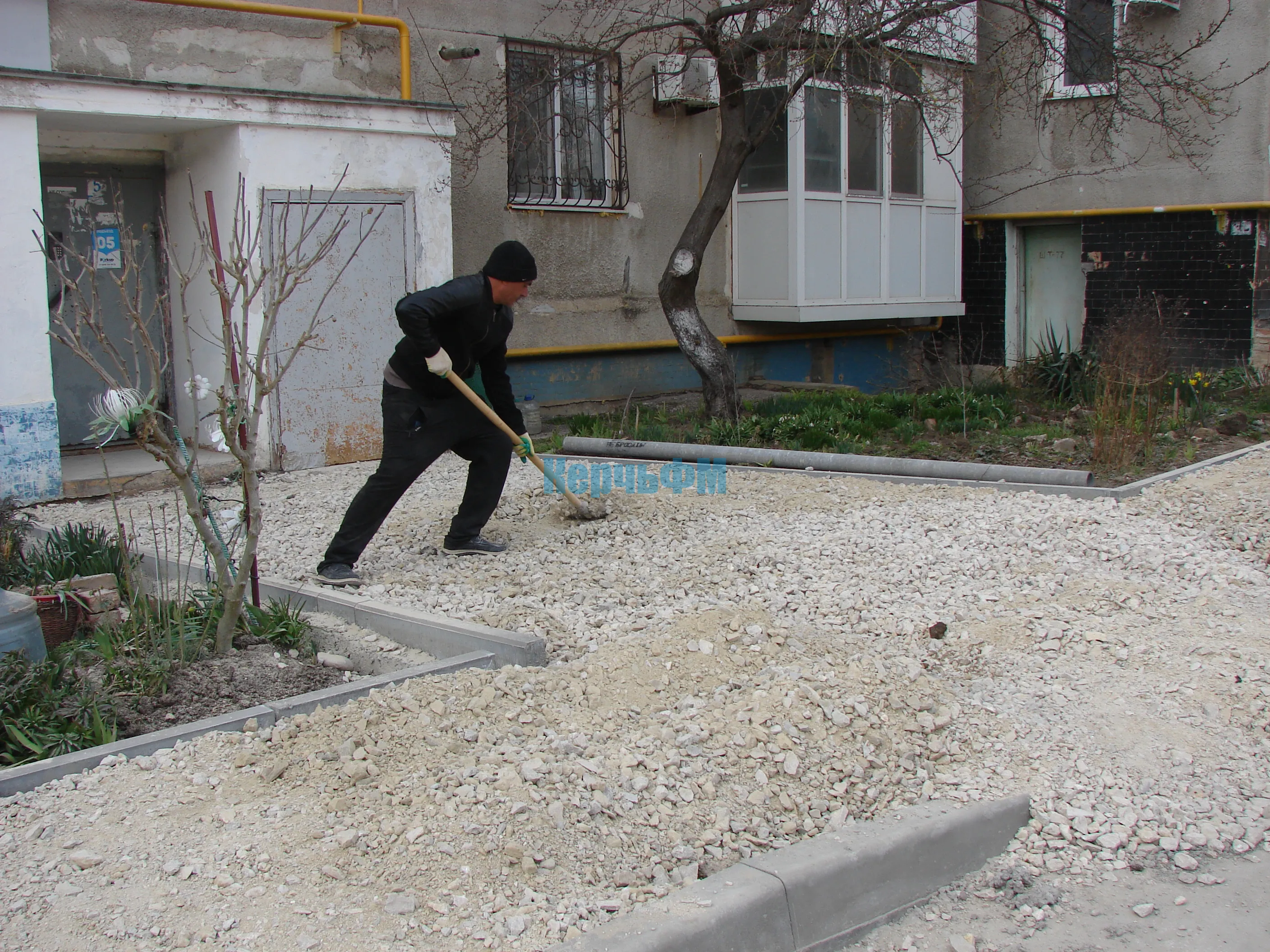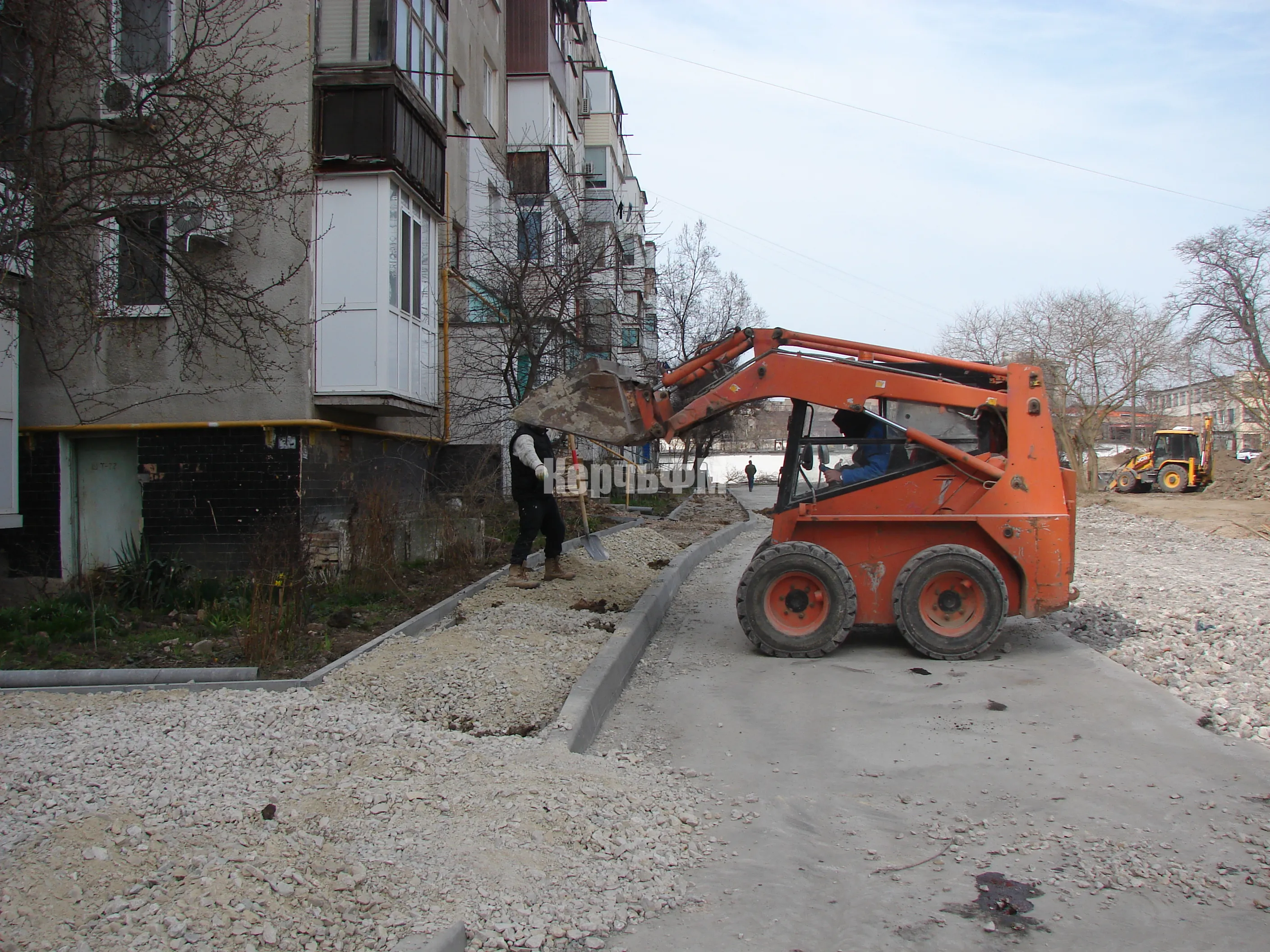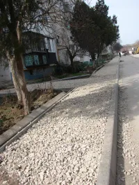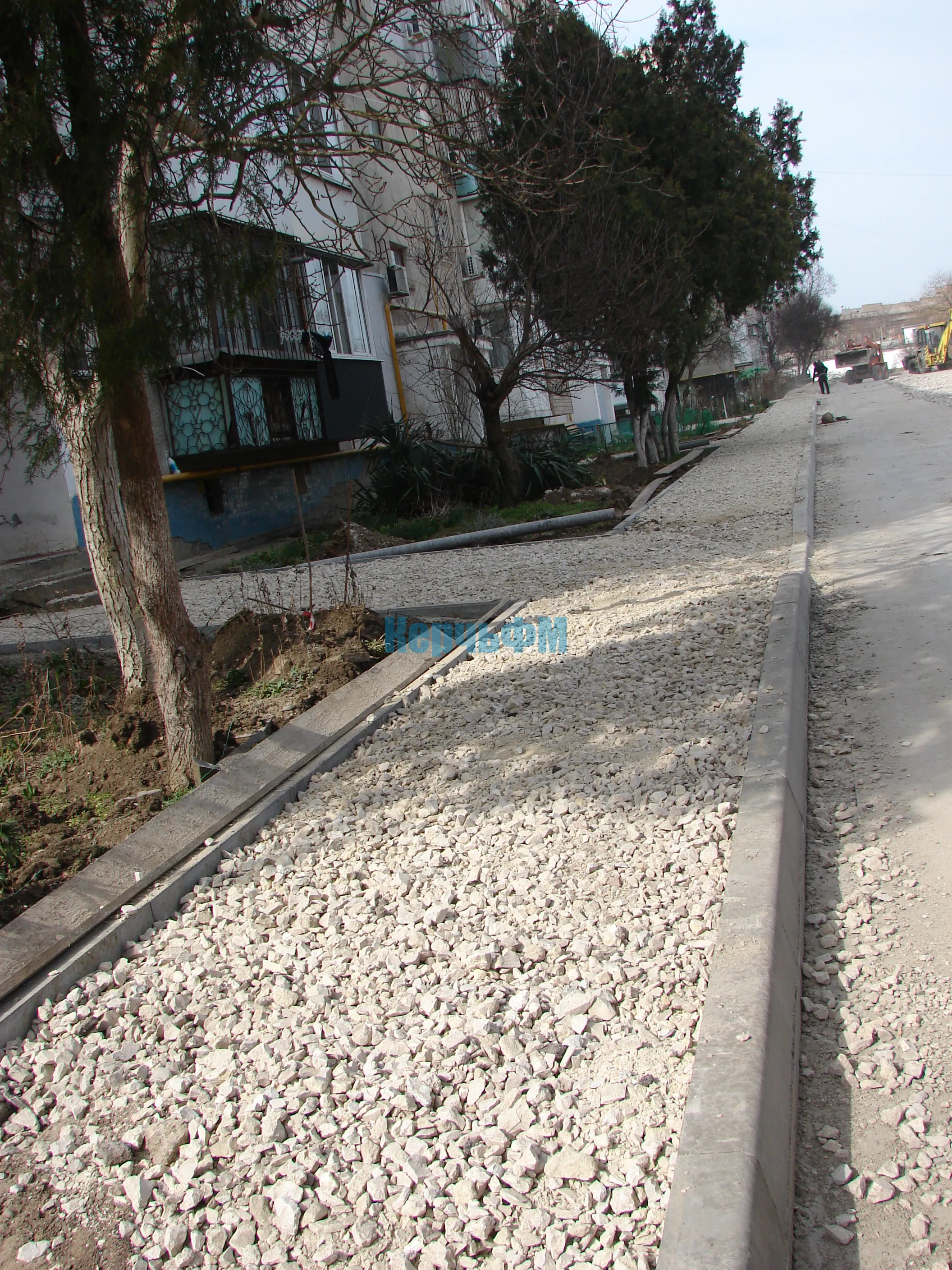 На тротуар и подъездные группы с уже установленным поребриком щебень завезен.