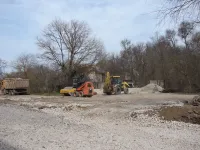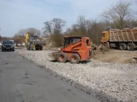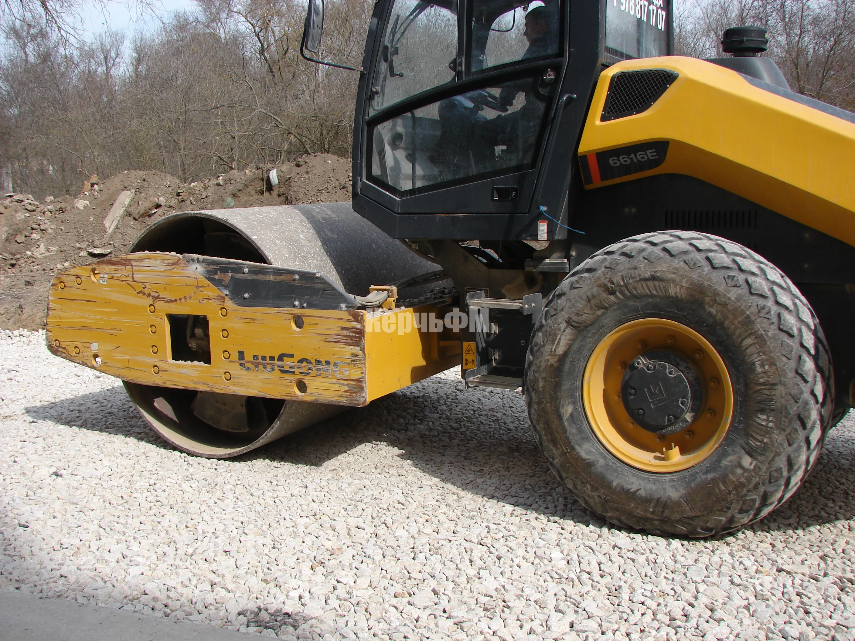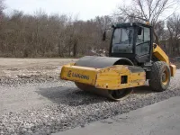 Завезенный щебень утрамбовывают на парковочных зонах.