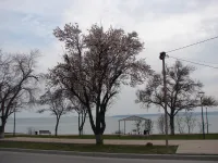 Увидеть цветущие нежным розовым цветом деревья можно вдоль дороги у зоны отдыха "Черепашка" и во многих дворах керчан.