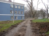 За зданием находится парковка с разбитым асфальтом, далее площадка, где учащиеся в теплое время года занимаются физкультурой.