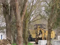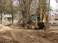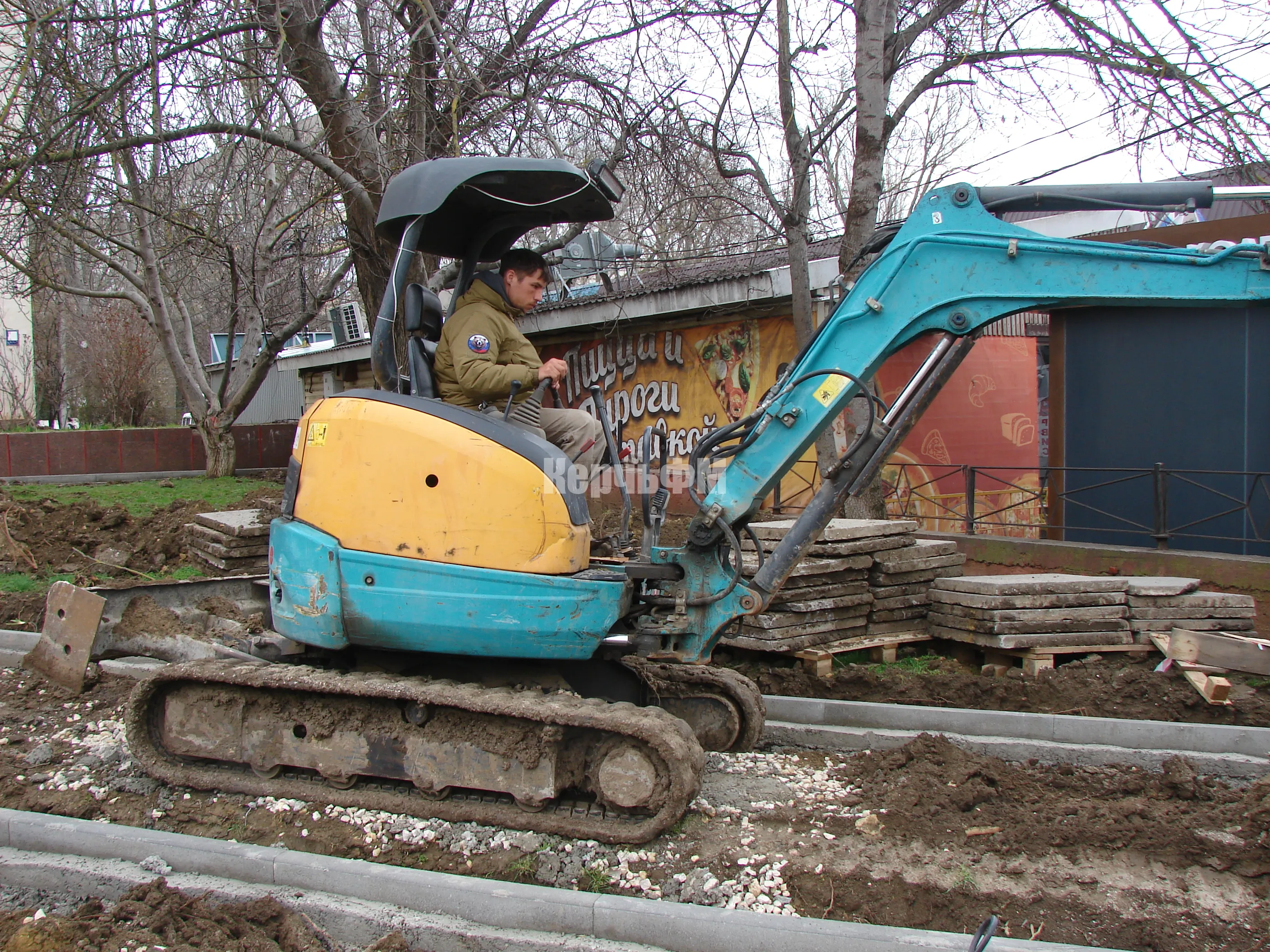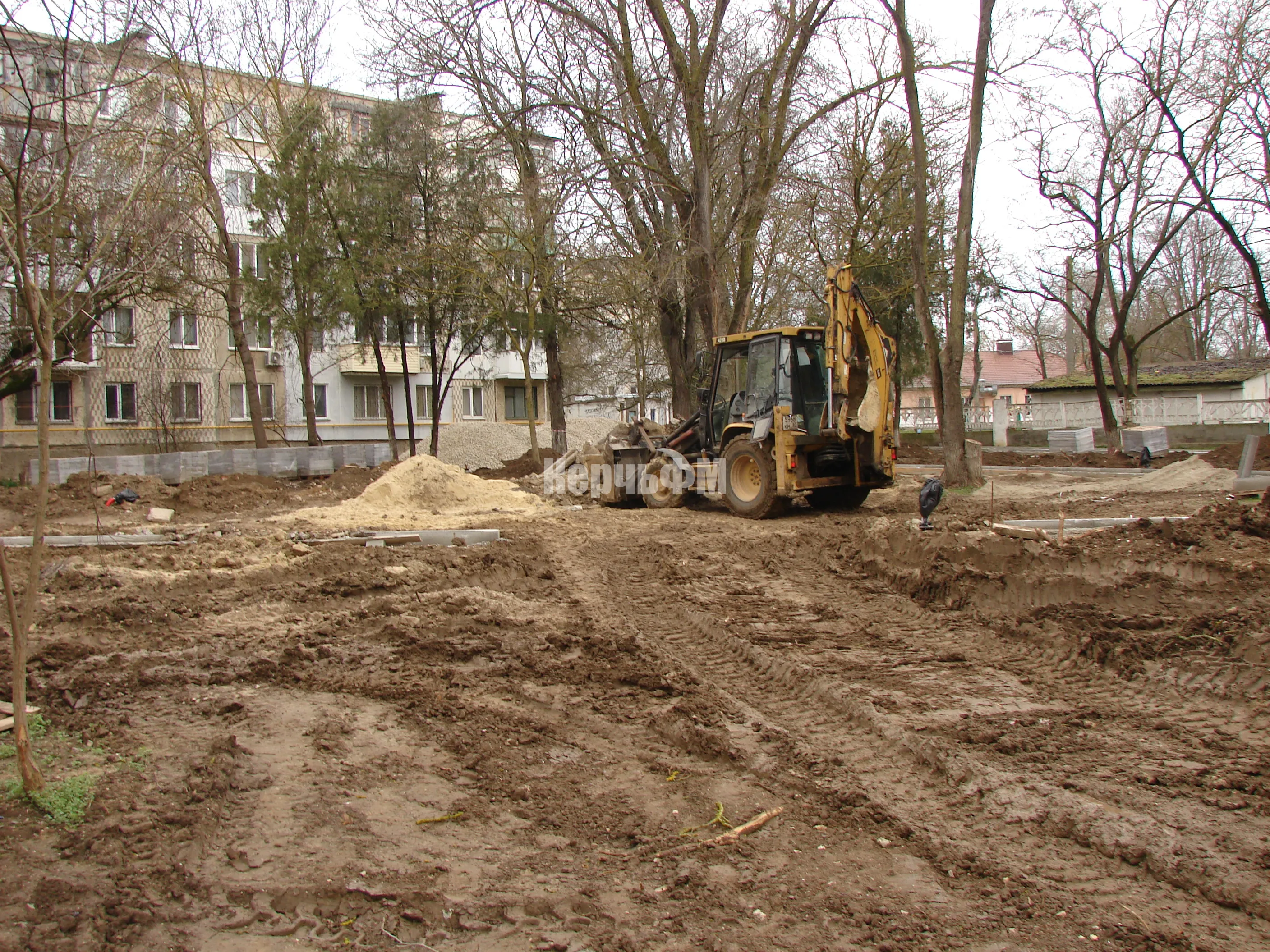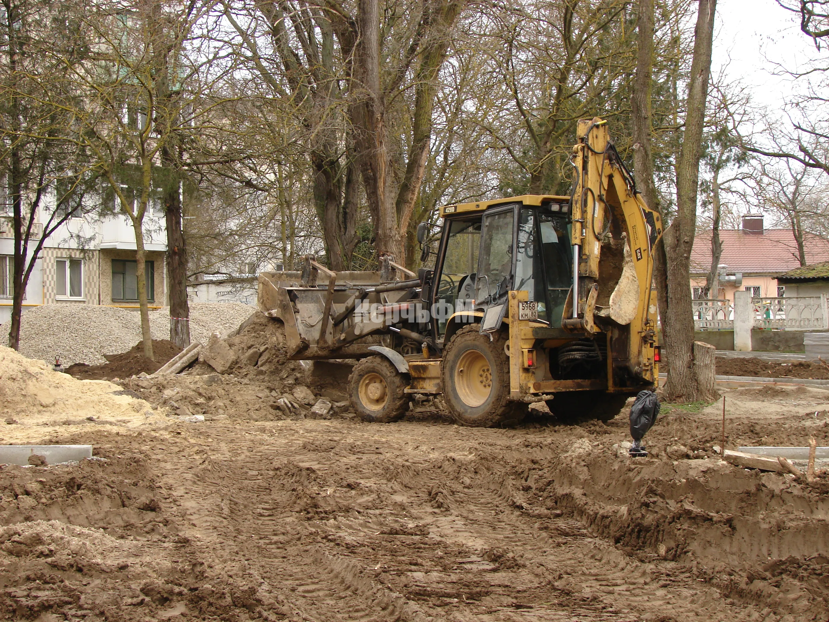 Сегодня тяжелая техника продолжает расчистку сквера от строительного мусора, а также равняет грунт на проходе со стороны торговых павильонов.