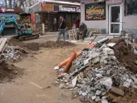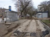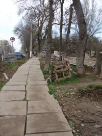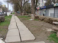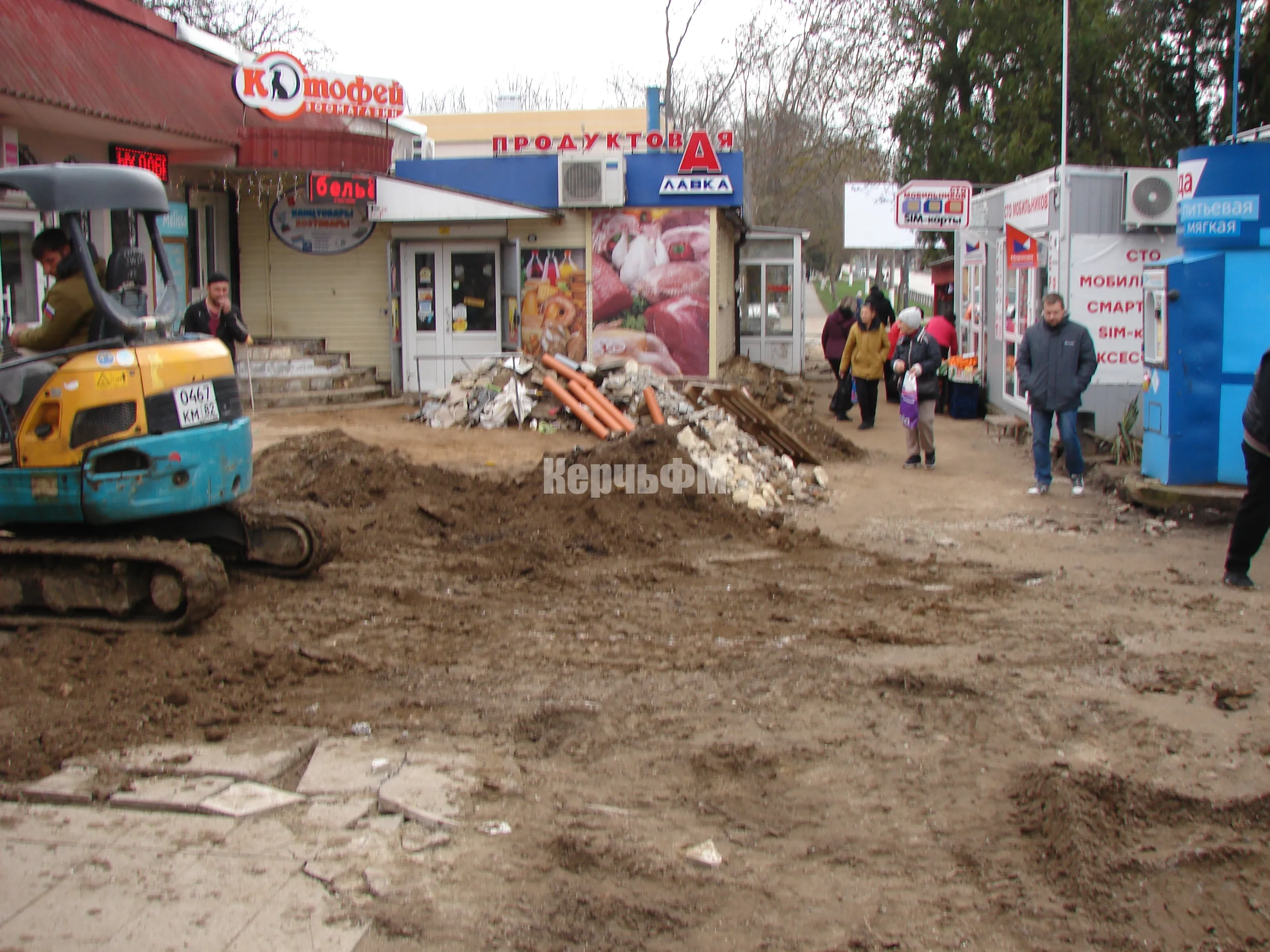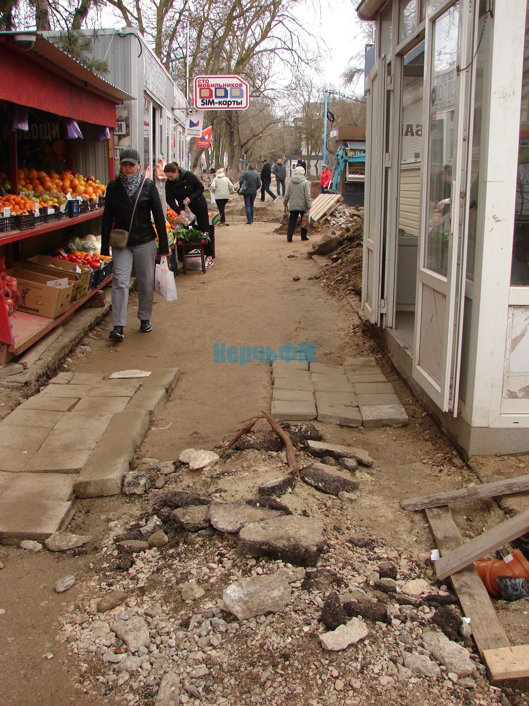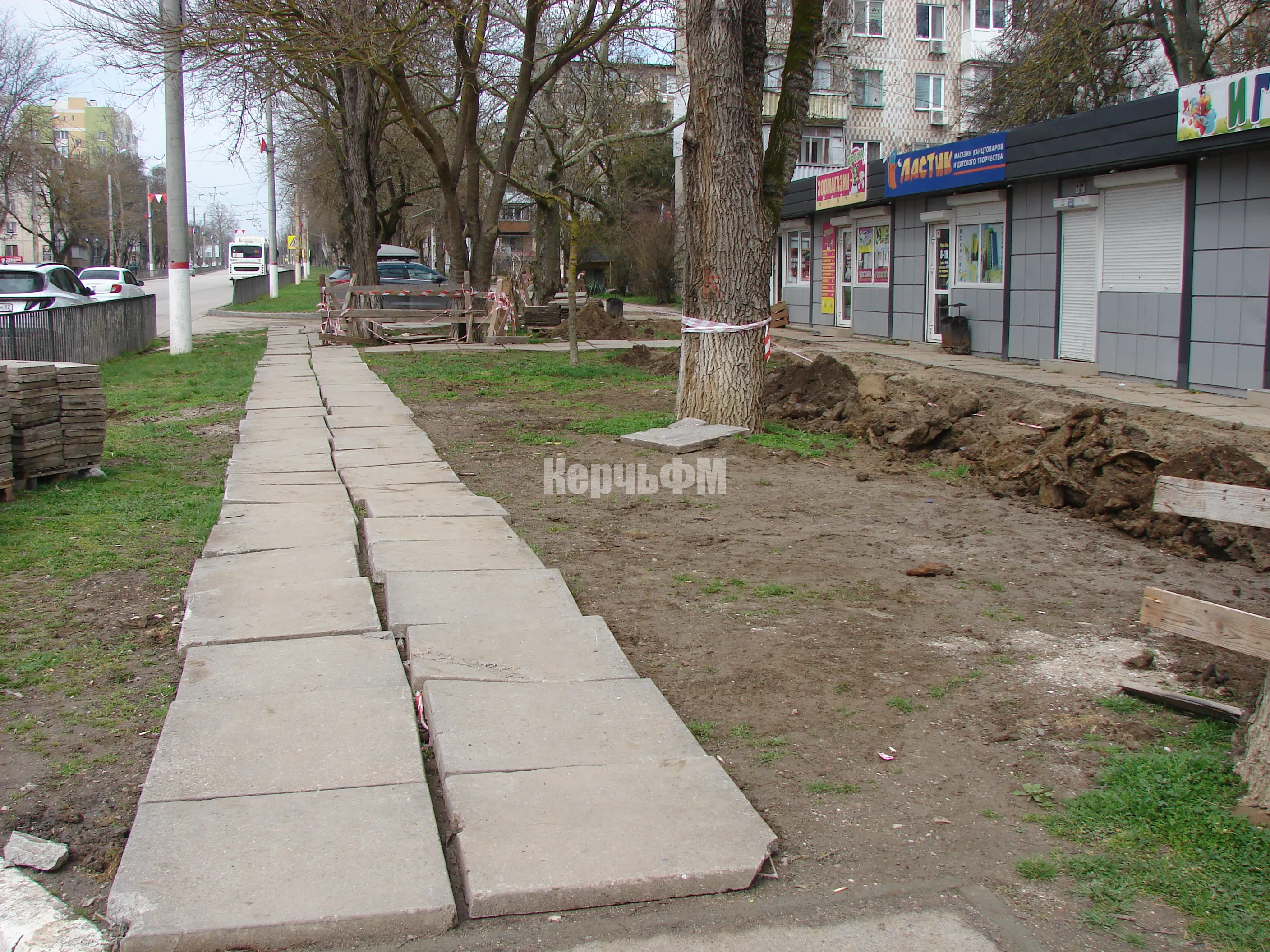 Кстати, для удобства пешеходов вдоль тротуара от супермаркета до конца торговых точек у остановки проложили дорожку из старых демонтированных плит, тем самым, обезопасив керчан от прохода по грязи.