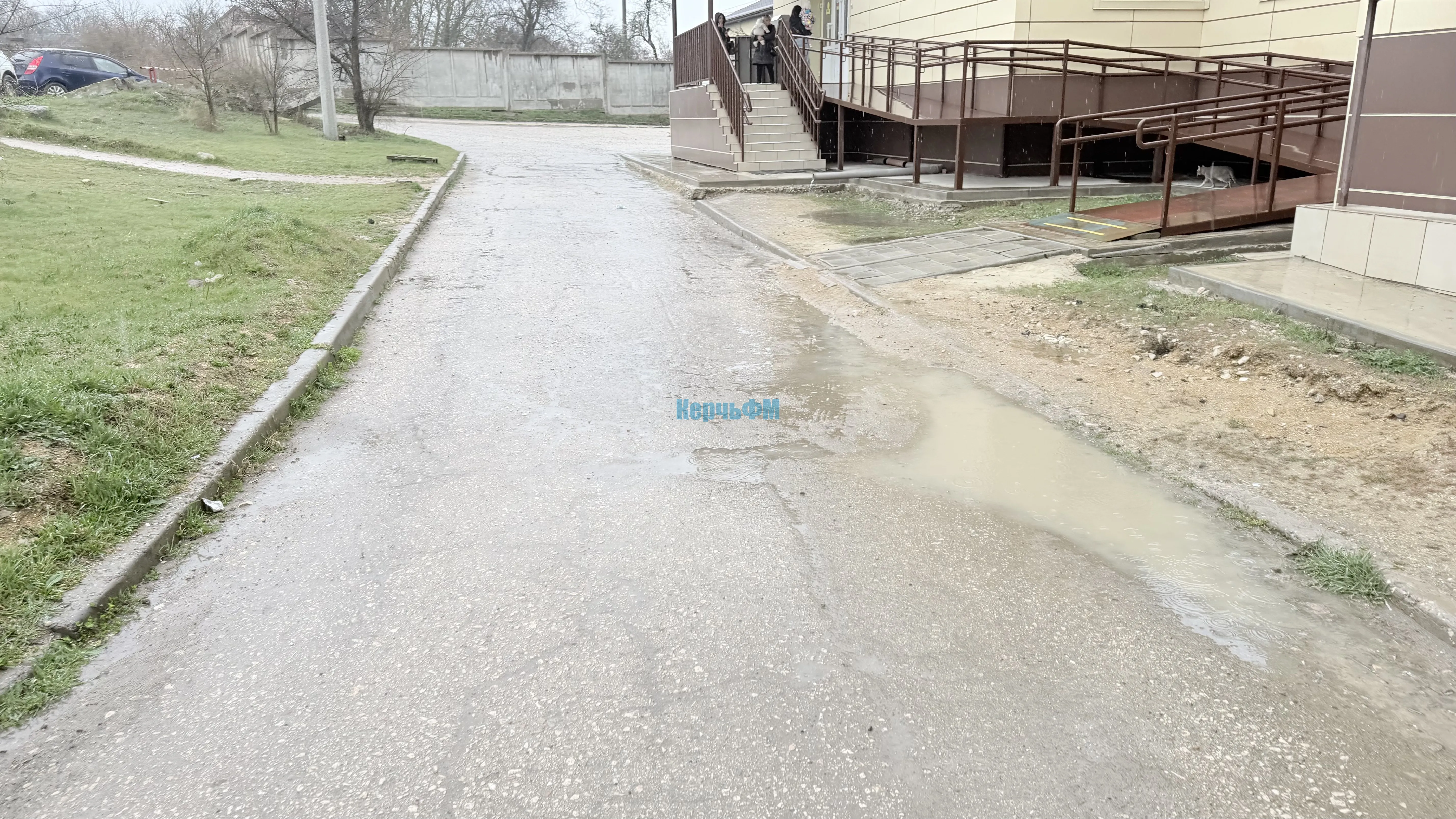 Чтобы попасть от дороги к поликлинике, керчанам приходится буквально пробираться по грязи, либо нести ребёнка на руках, либо идти вдвоём, стараясь не поскользнуться.