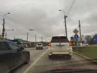 По дороге в город левый поворот проезжают на красный свет, тем самым не давая проехать пересекающему перекресток потоку.