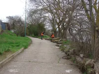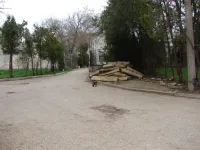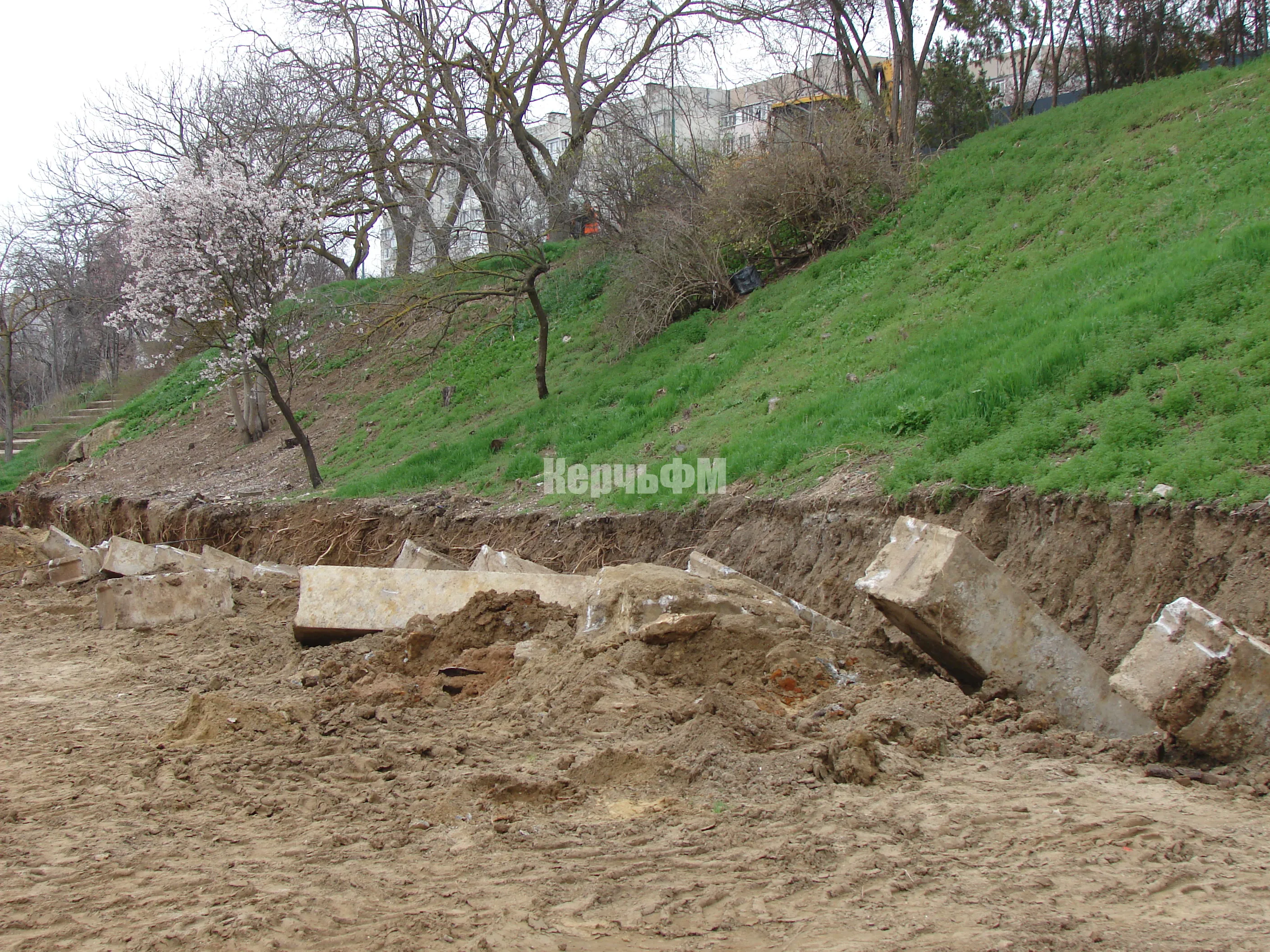 На втором ярусе общественной зоны сегодня ведется демонтаж бордюрного камня вдоль аллеи.