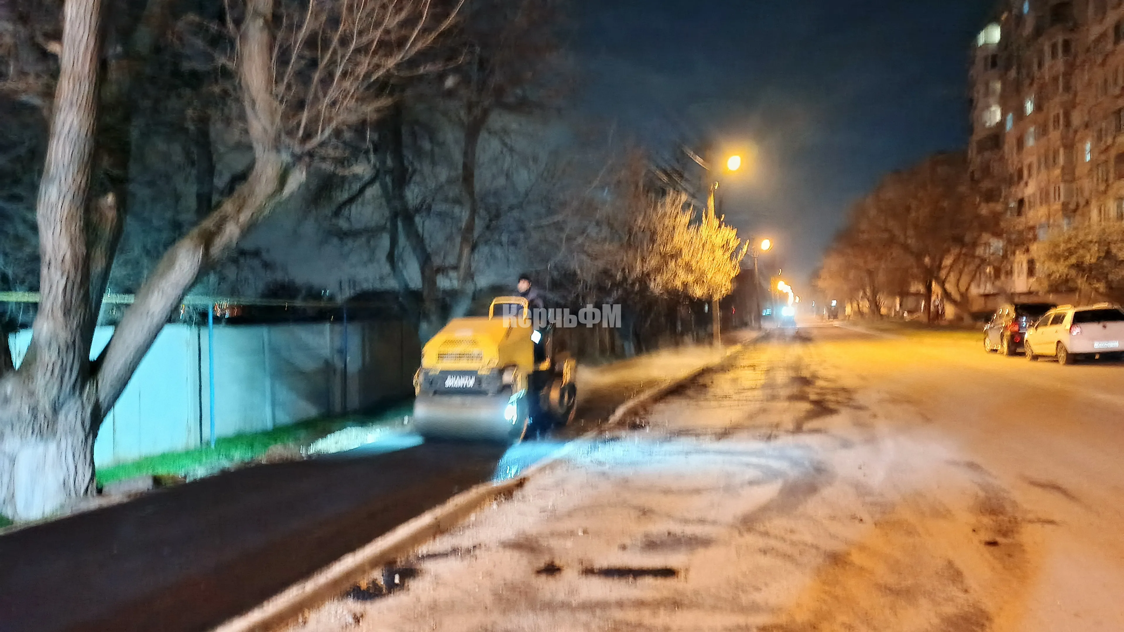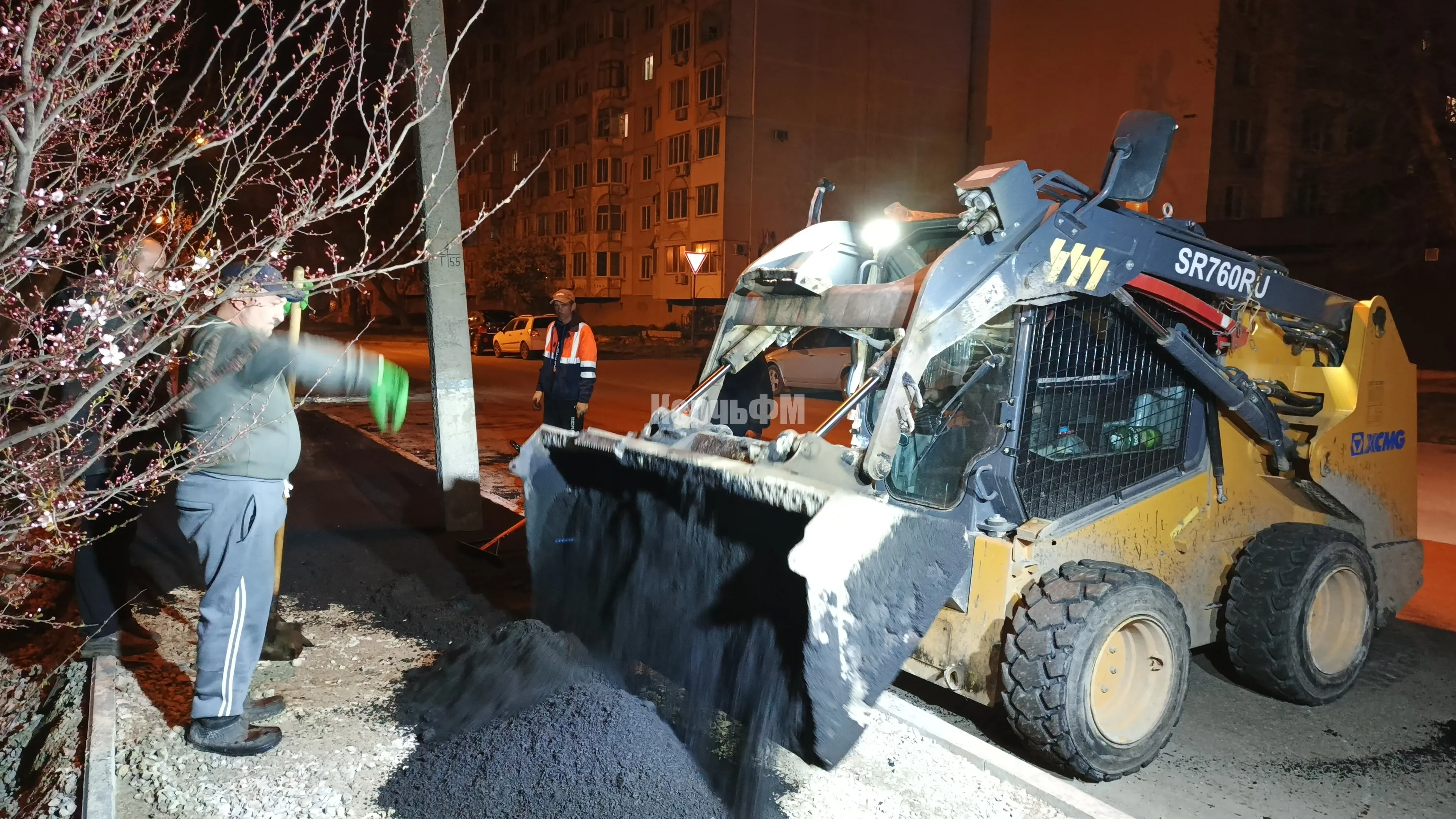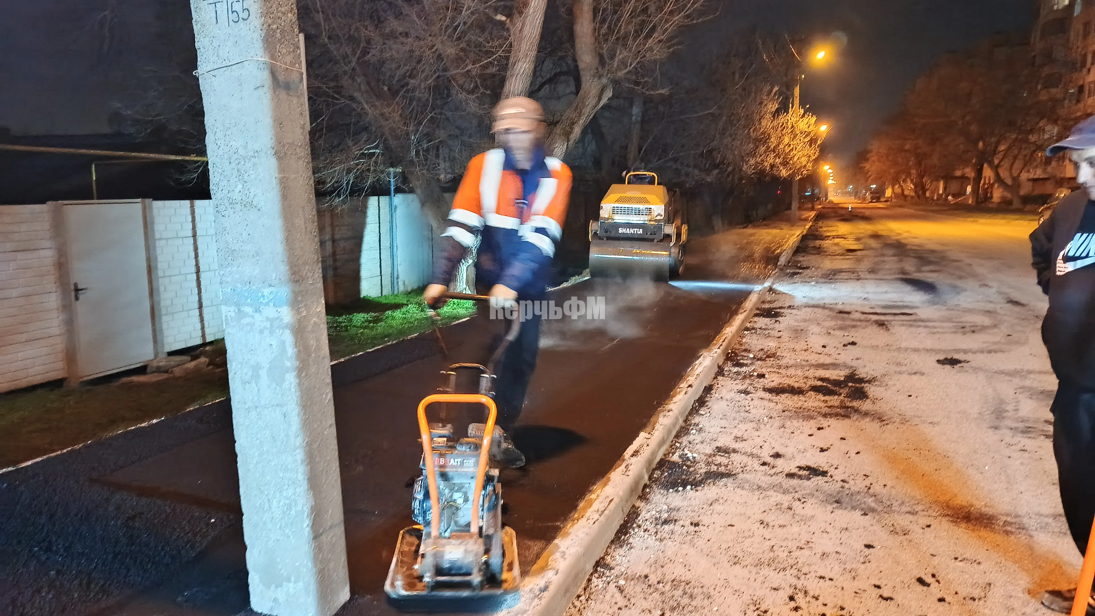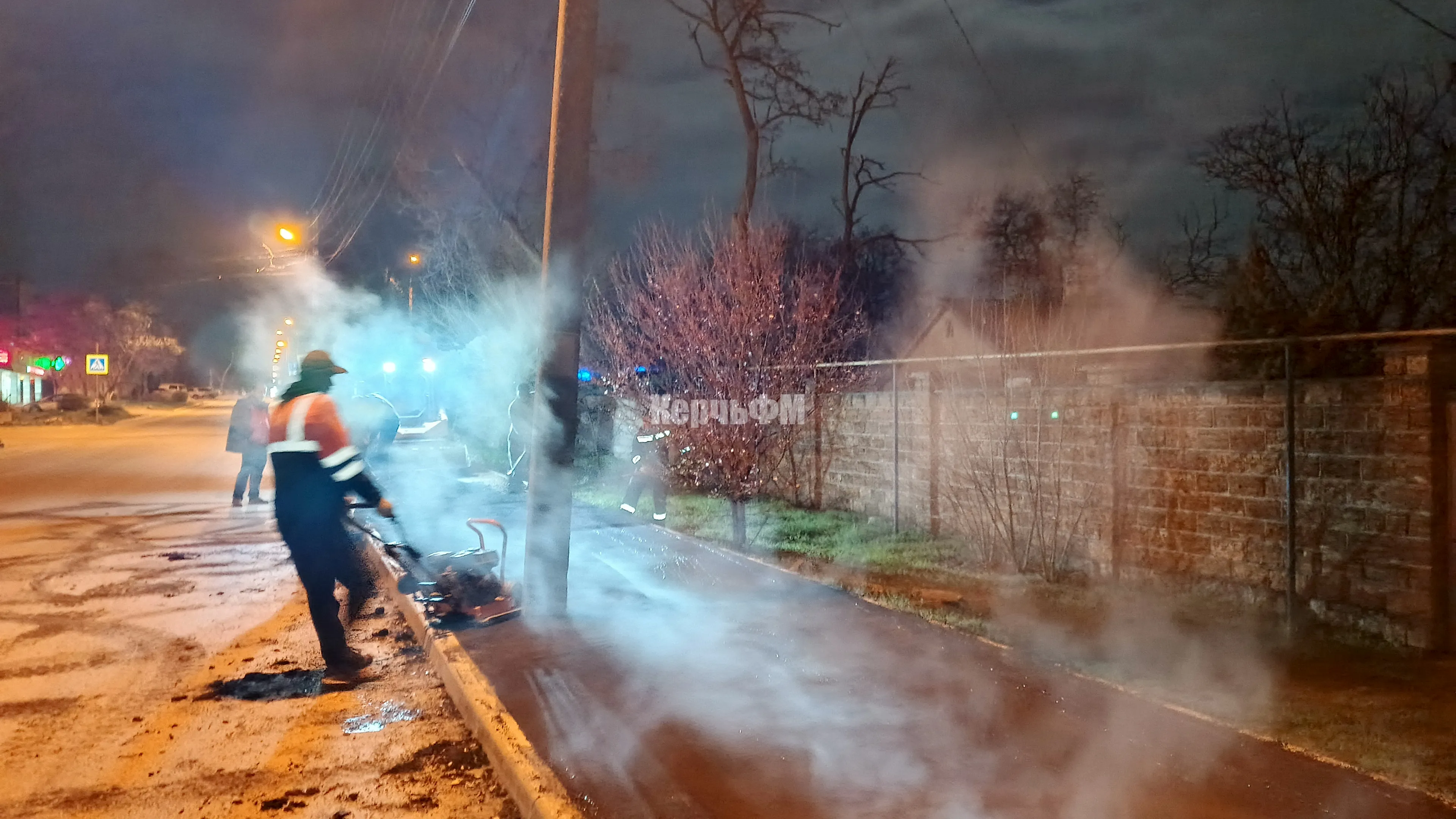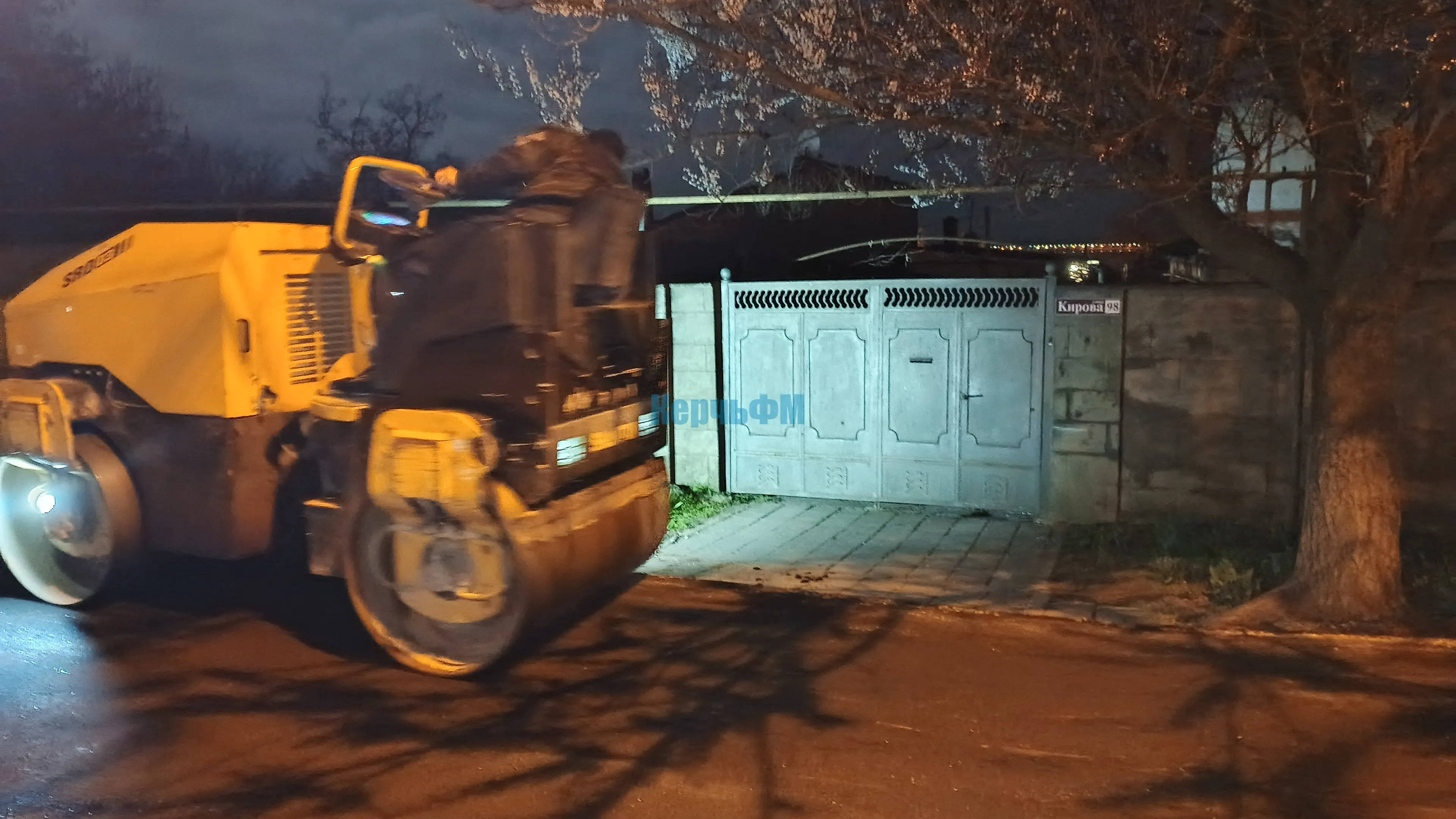 Сегодня ночью устроители подрядной организации "СТГ-Юг" продолжали асфальтировку нового тротуара по улице Кирова.