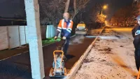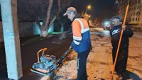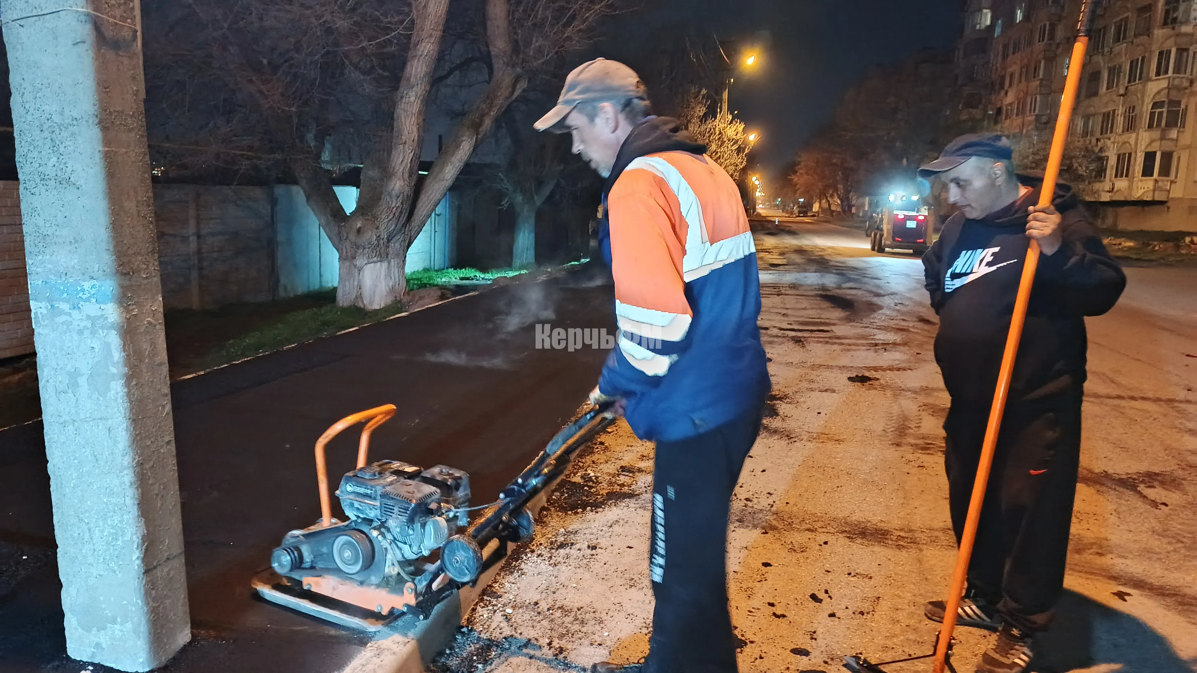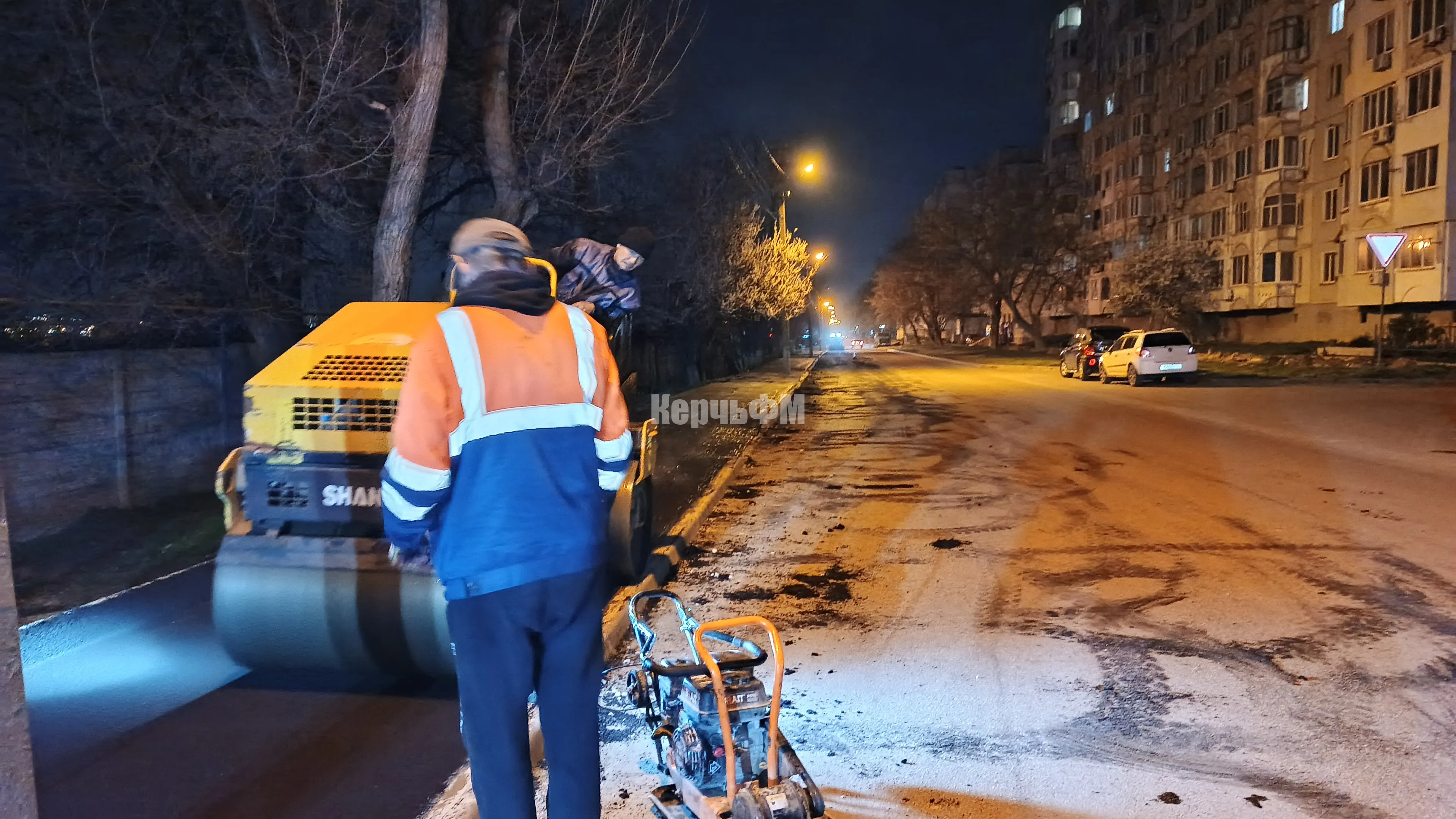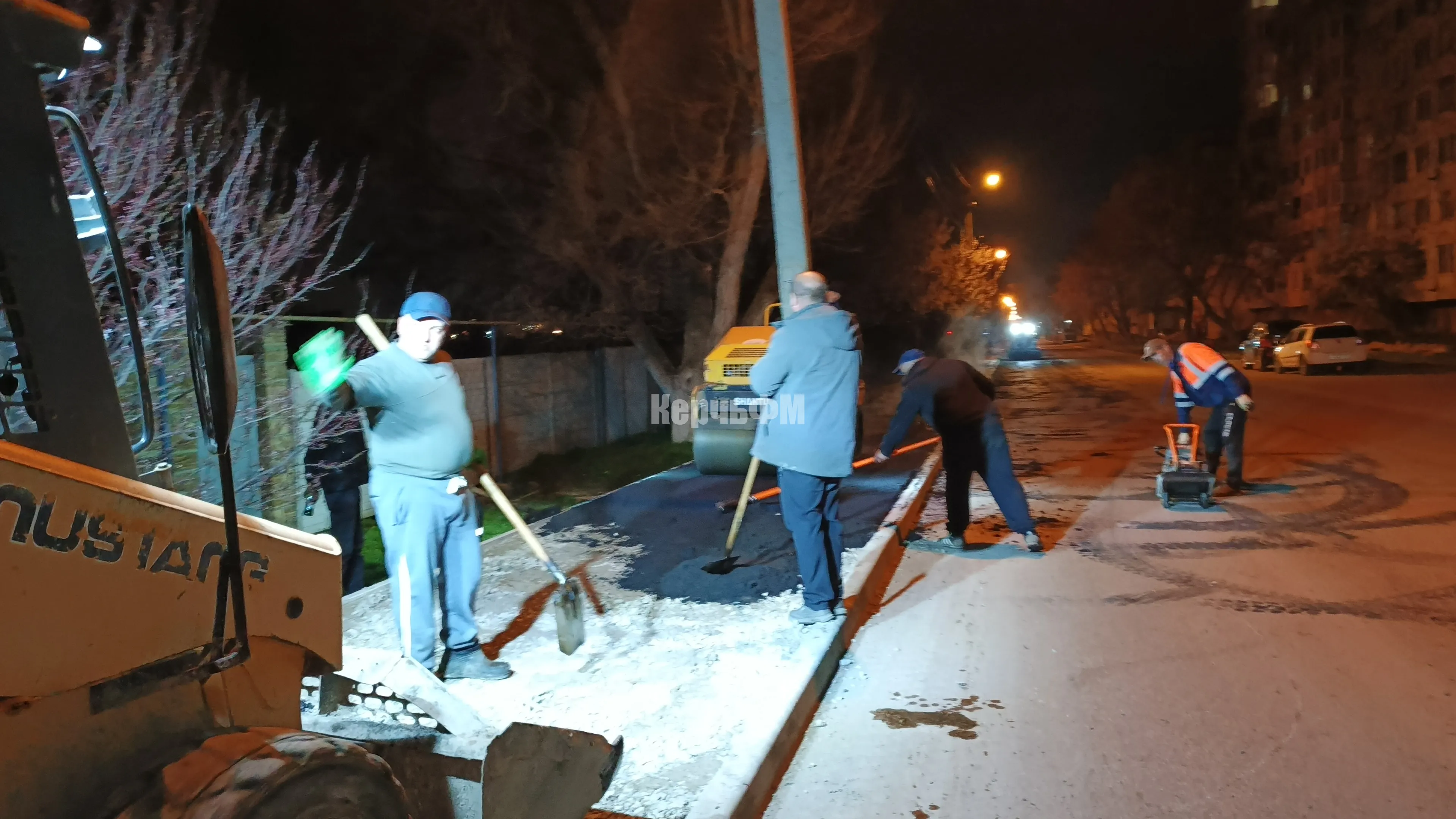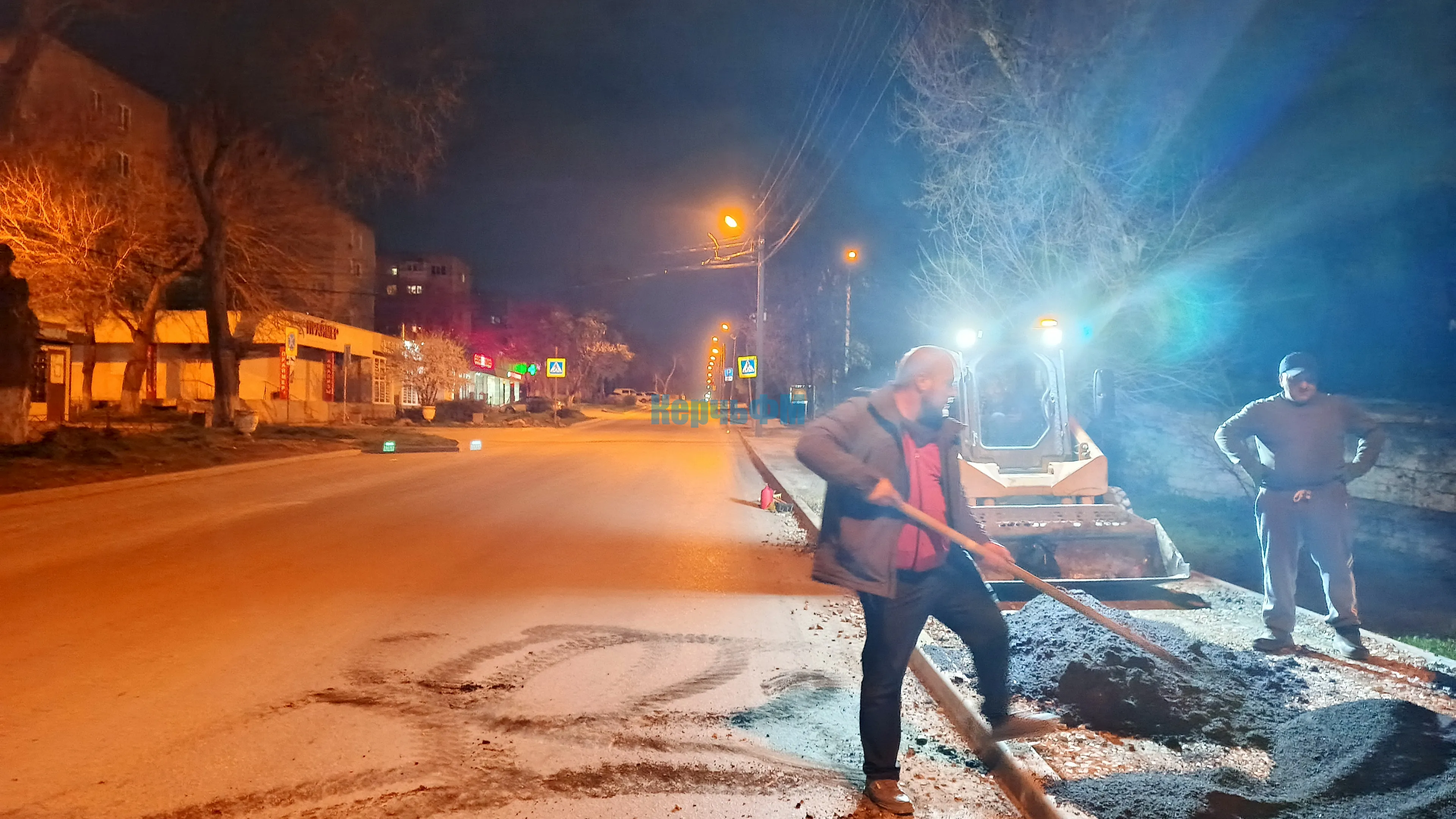 Сегодня ночью устроители подрядной организации "СТГ-Юг" продолжали асфальтировку нового тротуара по улице Кирова.