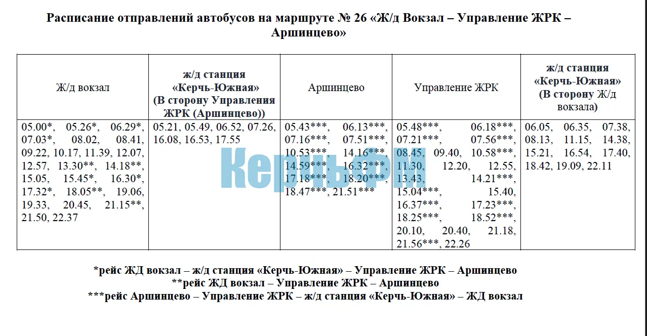 Расписание в тестовом режиме: с 03.04.2026 г. в ТЕСТОВОМ режиме будет изменено расписание движения автобусов на муниципальном маршруте регулярных перевозок № 26 «Ж/д Вокзал - Управление ЖРК - Аршинцево».