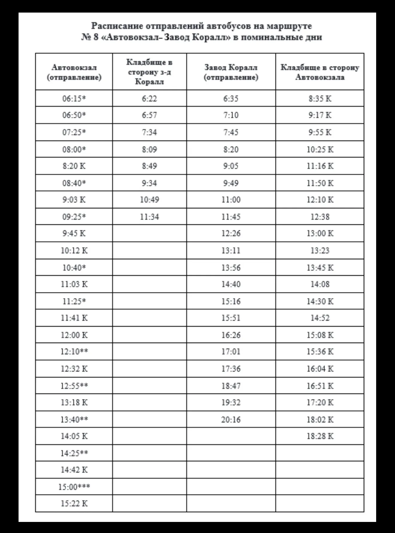 В период поминальных дней, с 18 по 21 апреля, движение автобусов на маршрутах №8 "Автовокзал - Завод "Коралл" и № 21 "Аршинцево - п. Партизанский" будет осуществляться по измененному графику.