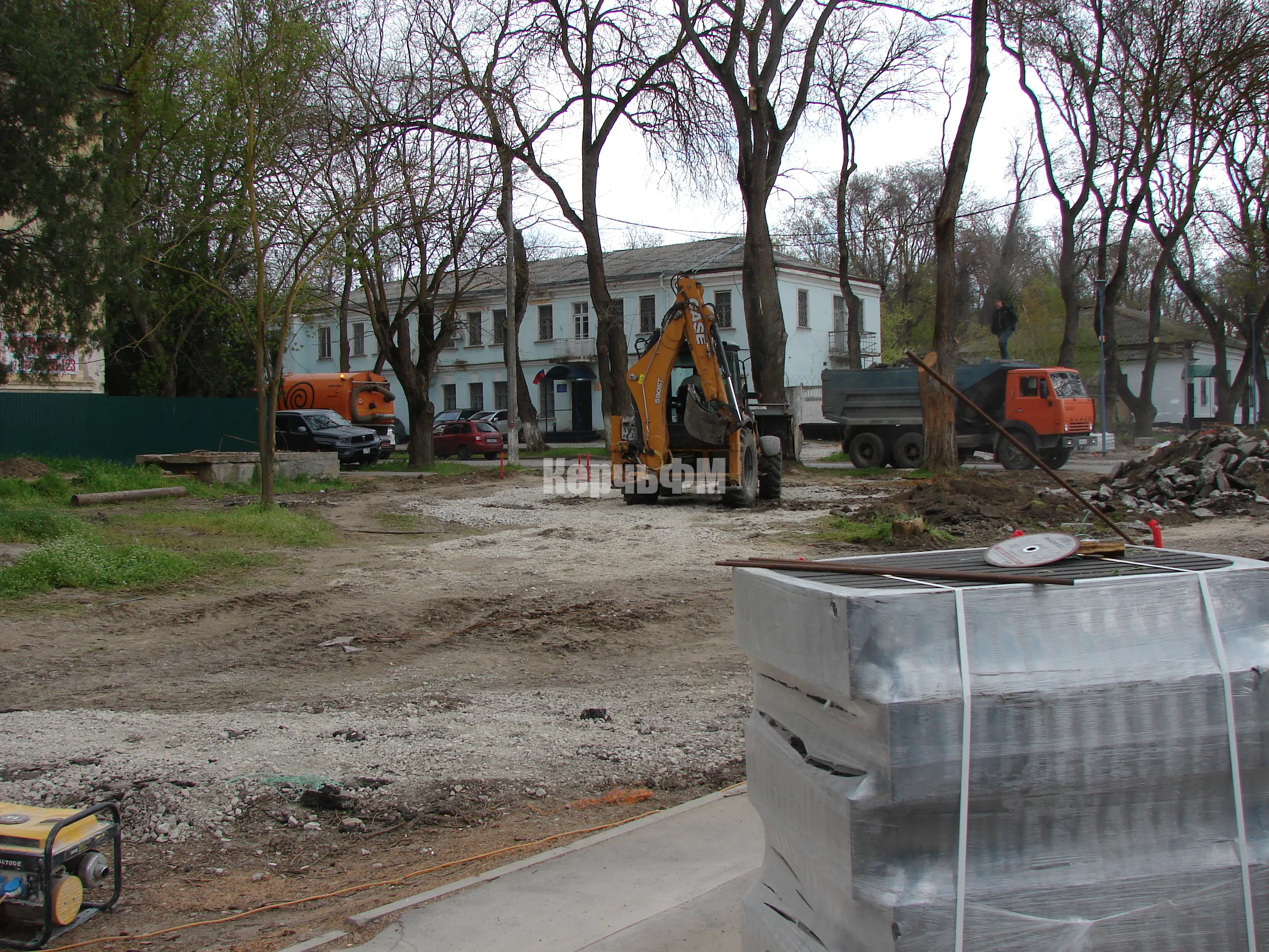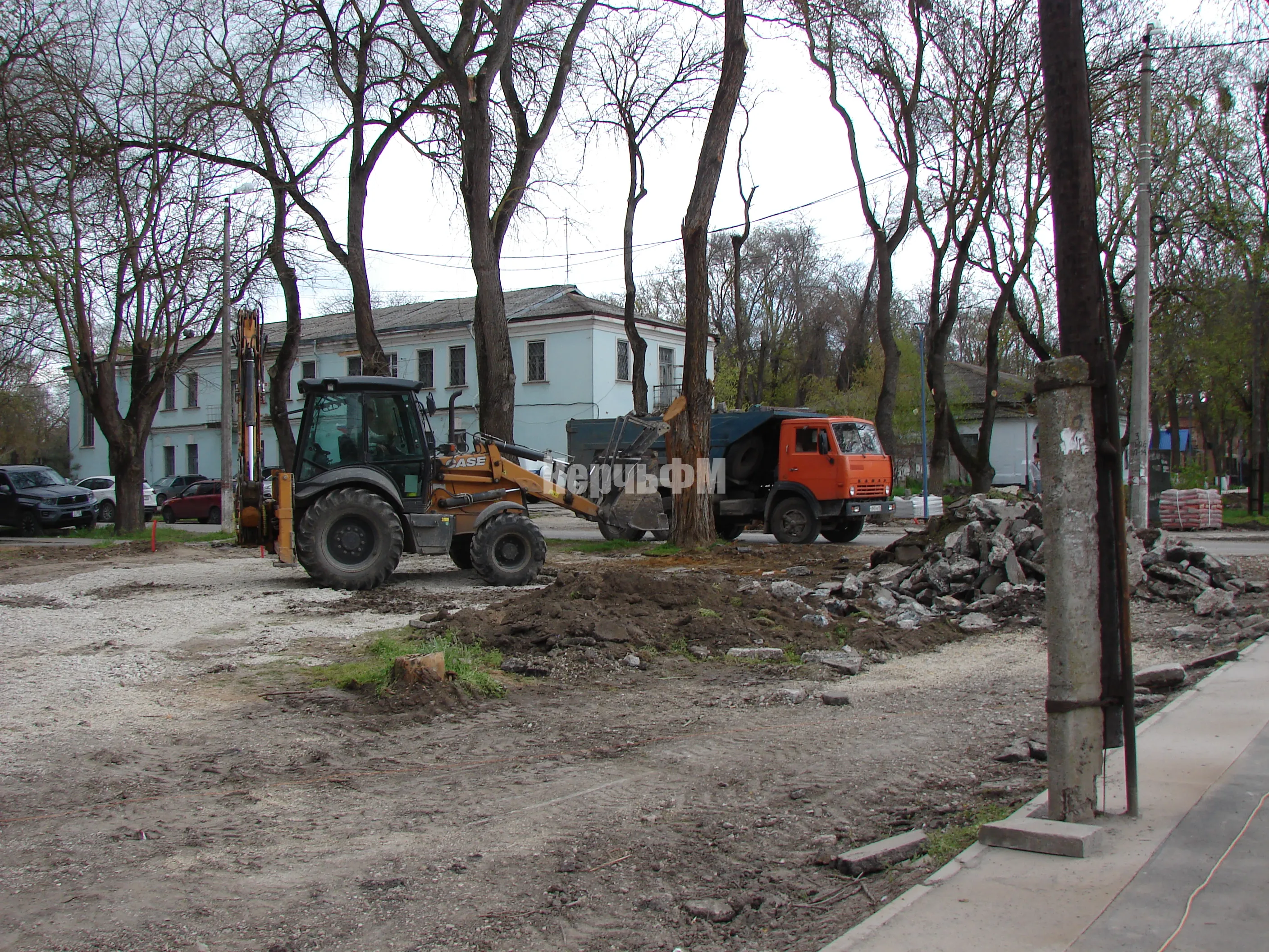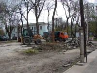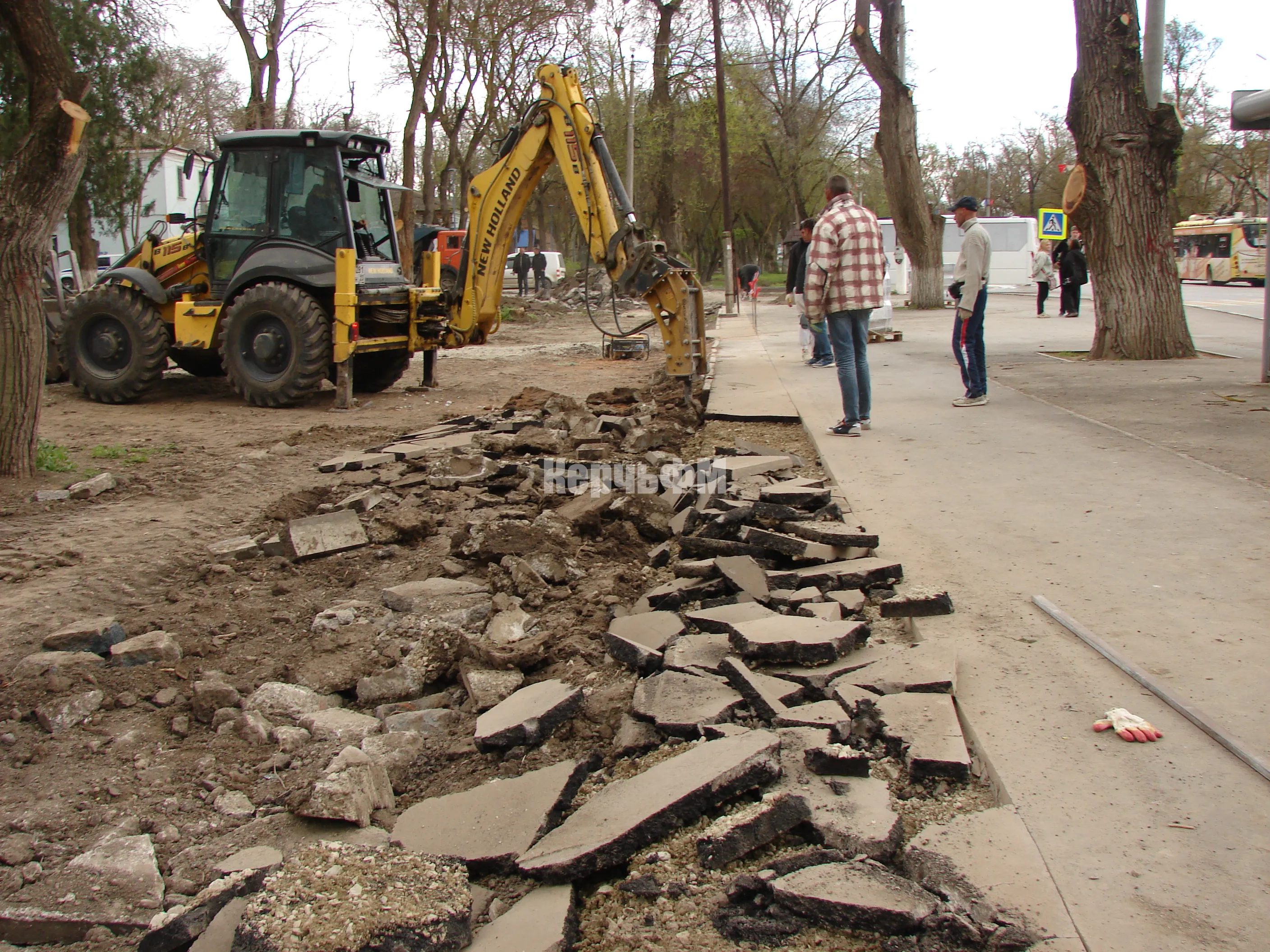 Тяжелая техника демонтирует старые бордюры и вывозит строительный мусор.