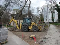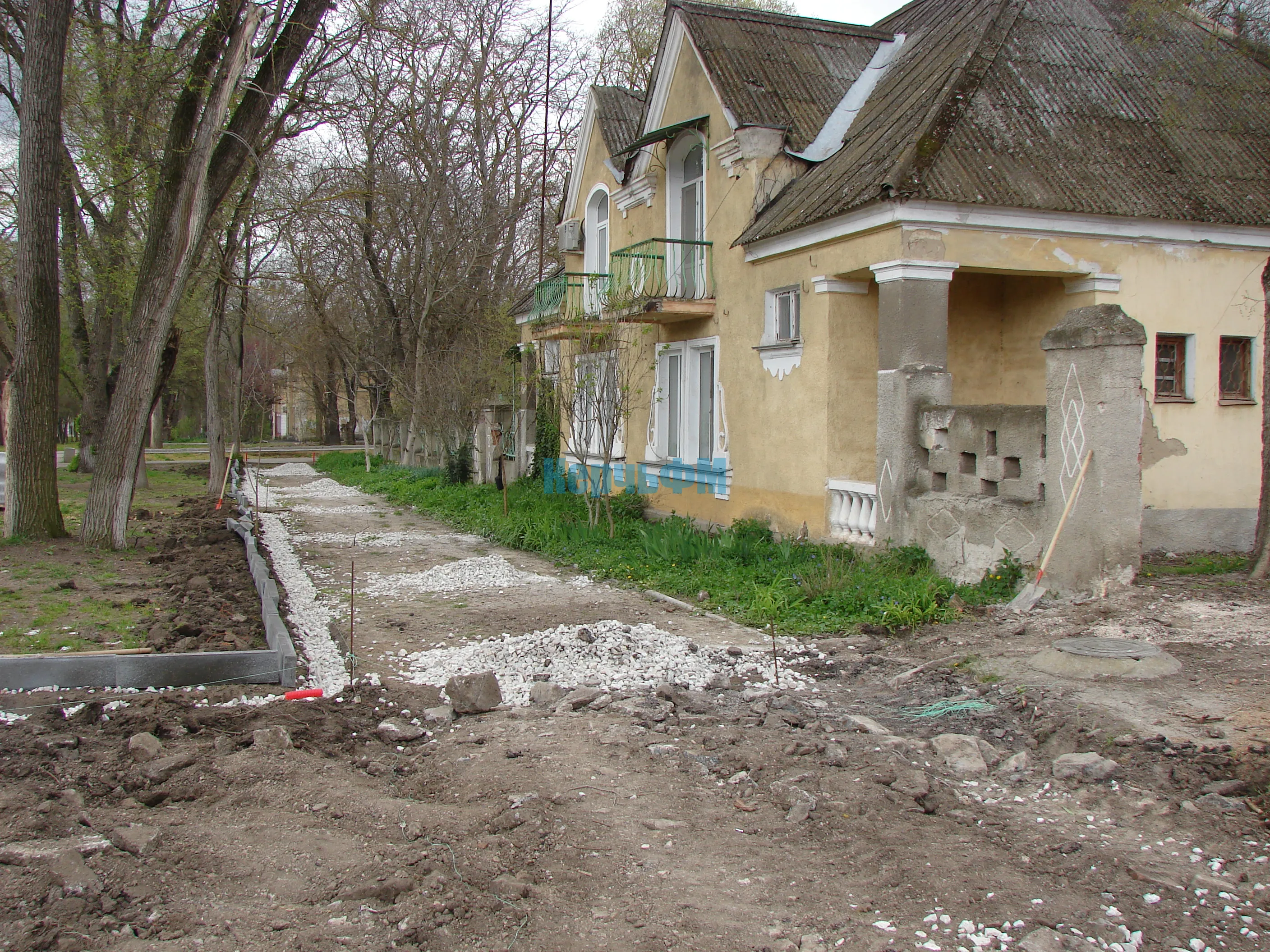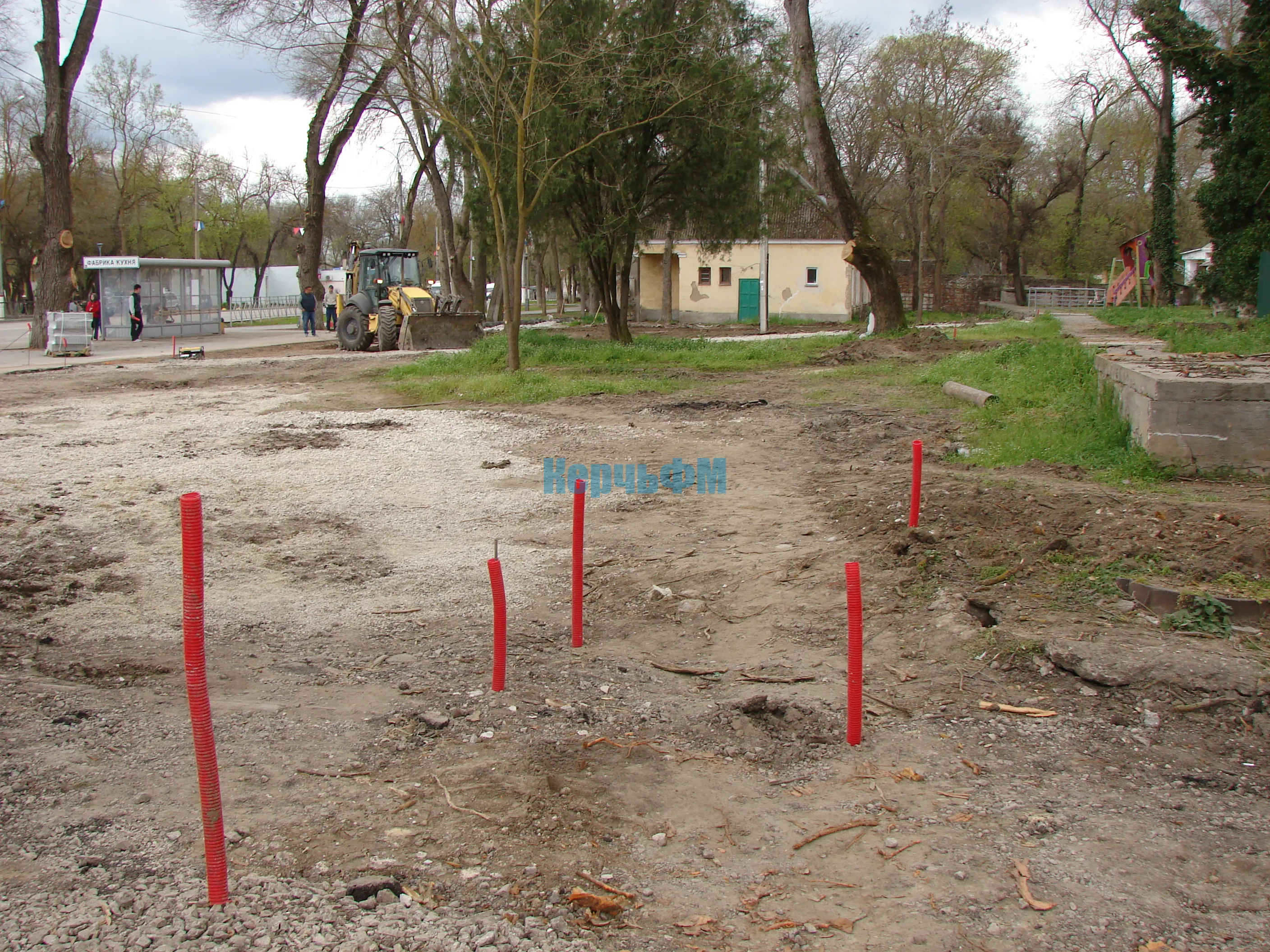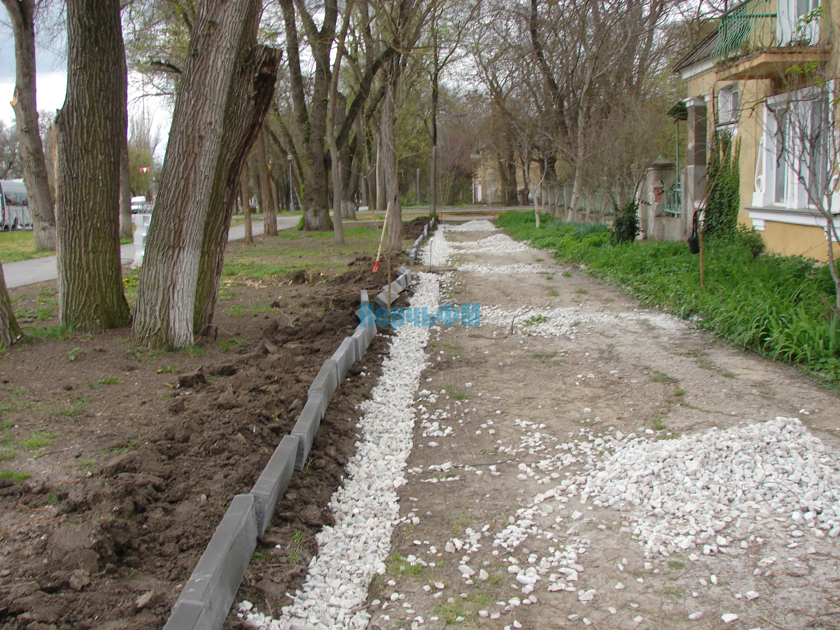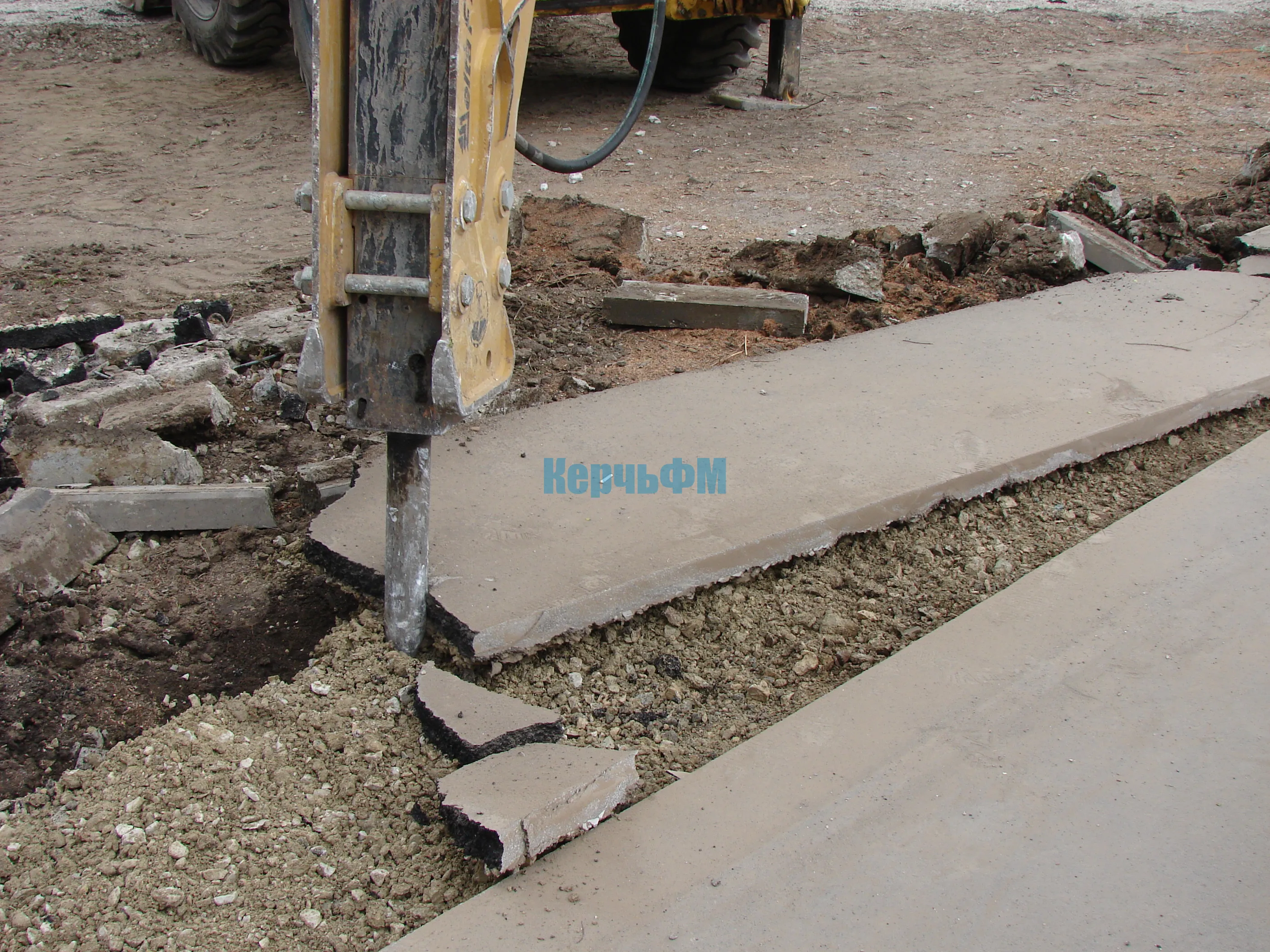 Тяжелая техника демонтирует старые бордюры и вывозит строительный мусор.