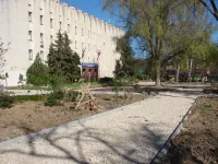 Намеченные и обнесенные бордюрами новые тротуарные дорожки, расширенная аллея вдоль Школы, которая ведет от супермаркета к остановке "Казакова", и сама площадь перед зданием, остаются без плитки.